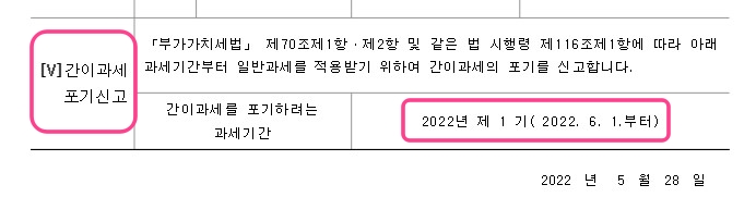 서식에서 간이과세 포기신고 부분에 체크하시고, 간이과세를 포기하려는 과세기간을 작성해주셔야 하는데, 저는 5월 28일에 신청서를 작성했기 때문에 다음 달 1일부터 작성을 하였습니다. 보통 포기 신청을 하는 다음 달 1일부터 일반과세가 적용된다고 하니 신청서 작성하실 때 참고해주세요.