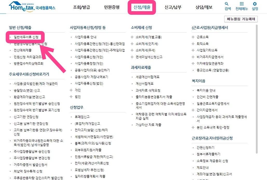 로그인을 한 후 [신청/제출] - [일반세무서류 신청]을 클릭해줍니다
