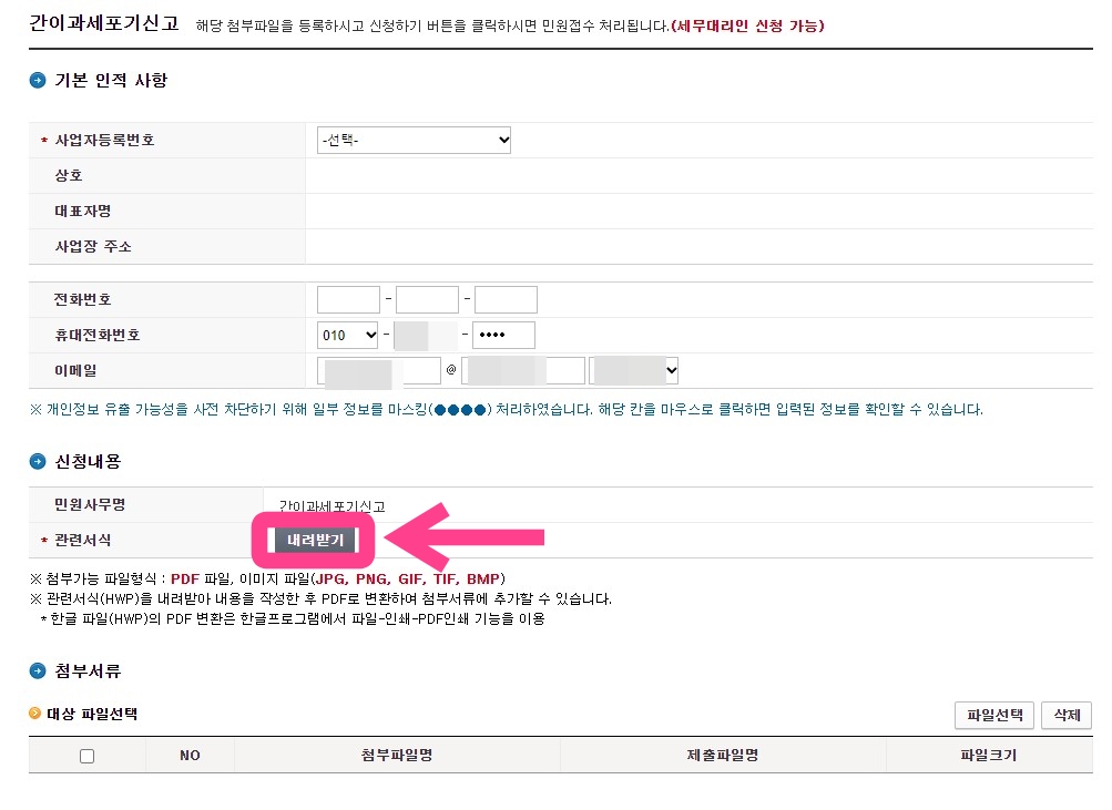 [사업자등록번호를 선택 - 휴대전화번호와 이메일을 확인] 기본 인적 사항을 확인하였다면 관련서식을 다운로드하여줍니다.