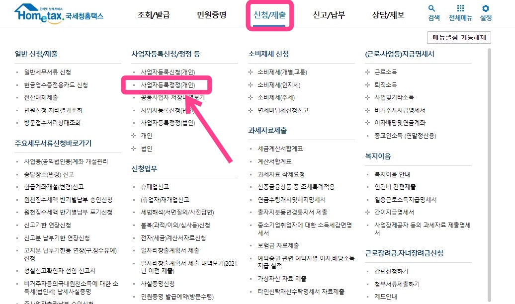 [신청/제출] - [사업장등록신청/정정] - [사업자등록정정(개인)] 을 선택해주세요