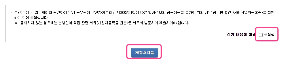 담당 공무원이 사업자등록증을 확인하는 것에 동의하는 내용이구요, [동의함]에 체크해주고 저장 후 다음으로 넘어갑니다