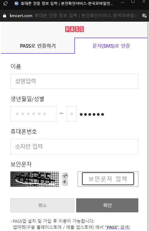 PASS 앱의 경우에는 설치 후 가입이 필요하구요, 한번 등록해놓으면 이렇게 인증을 받아야 하는 경우에 굉장히 편리해요. 하지만 전 문자를 이용해서 인증을 받을 거예요 ㅎㅎ