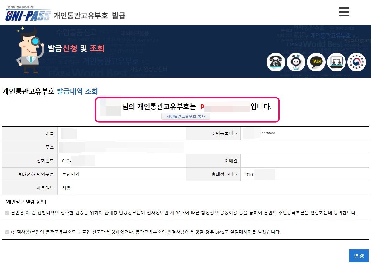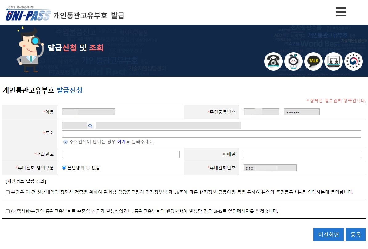 개인정보 열람 동의에 체크해주시고, 선택사항은 내가 해외에서 물품을 구매해 수출입 신고가 발생한 경우, 또는 통관 번호의 주소나 휴대폰 번호를 변경했다거나 하는 경우 알림 문자를 받겠다는 내용이에요. 필요하신 분만 선택하시면 될 것 같아요.