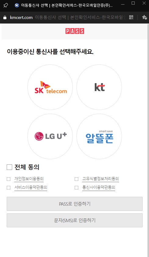 그러면 이렇게 새 창이 뜨면서 본인인증을 위한 창이 떠요. PASS 또는 문자로 인증해주세요.