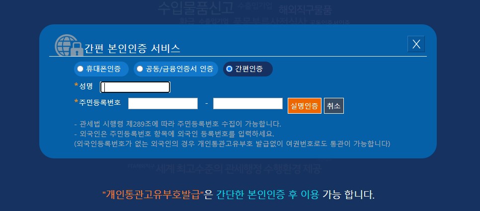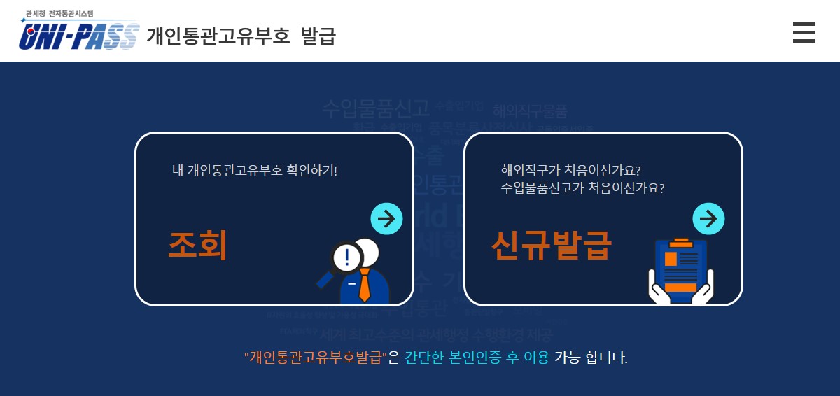 관세청 사이트 상단에 아주 크게 조회와 신규발급을 위한 창이 있어요. 사이트에도 적혀있듯이 간단한 본인인증 후 이용이 가능하기 때문에 본인인증 수단을 꼭 미리 준비하는 것 잊지 마세요!