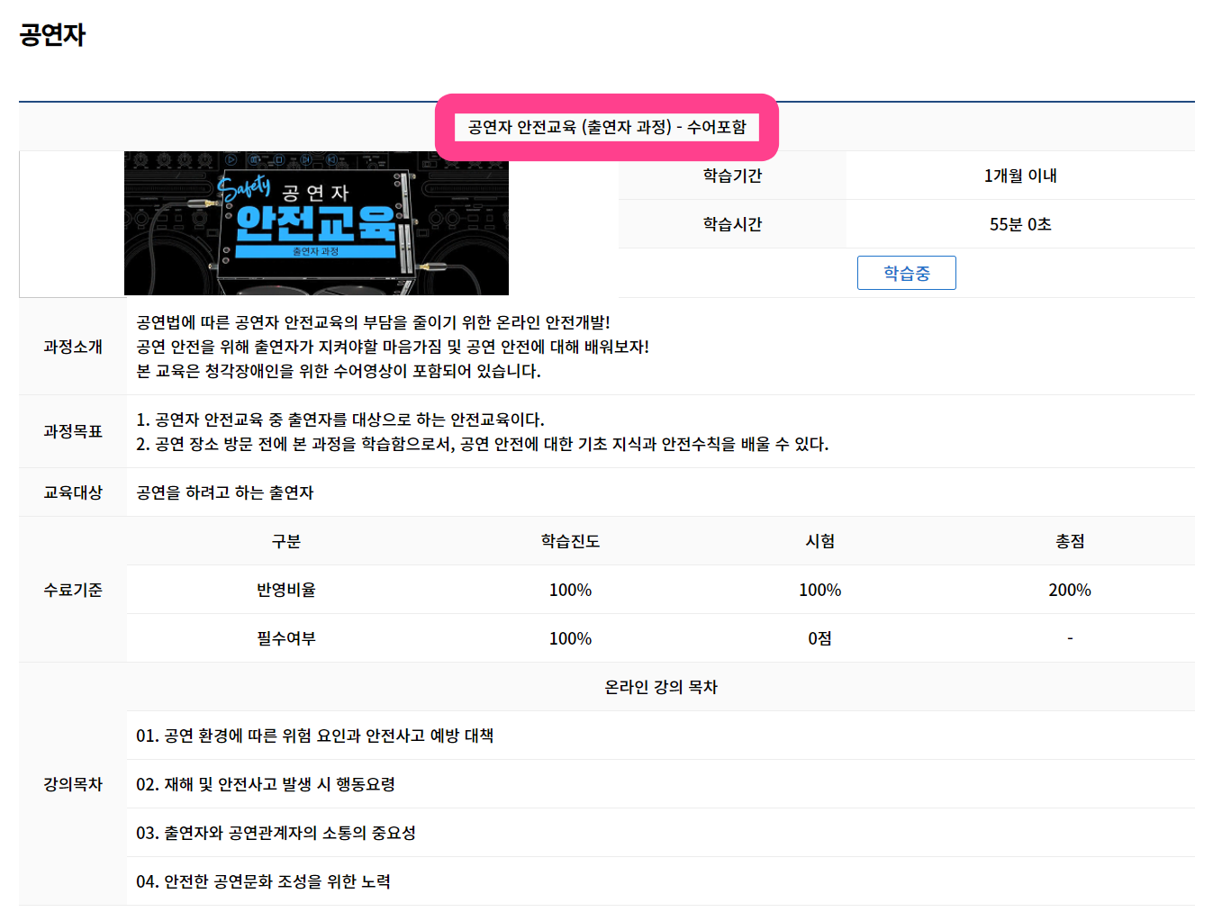 공연자 안전 교육에는 출연자와 스태프 및 작업자 과정이 있습니다. 자신이 해당되는 내용의 교육을 이수해야 하니 정확하게 확인하시고 수강 신청을 하셔야 합니다.