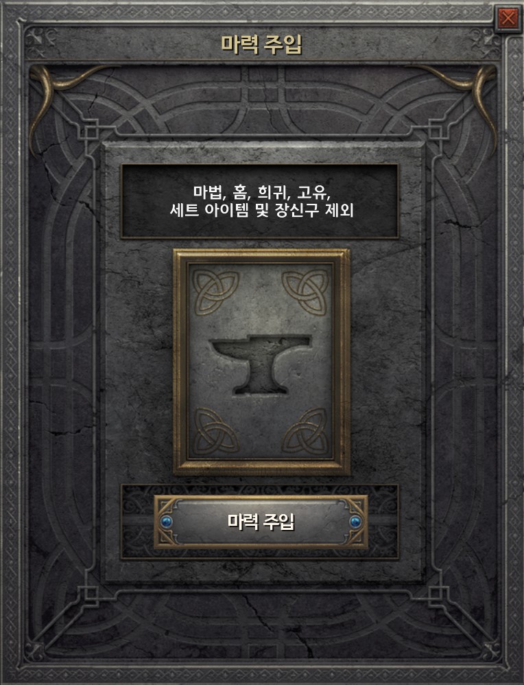 - 마력 주입은 노말 아이템(흰템)을 레어 아이템(노란템)으로 인챈트 해주는 기능