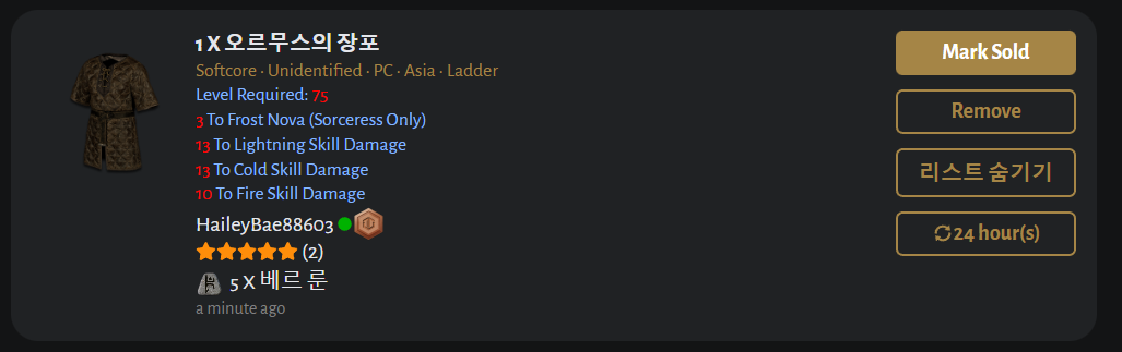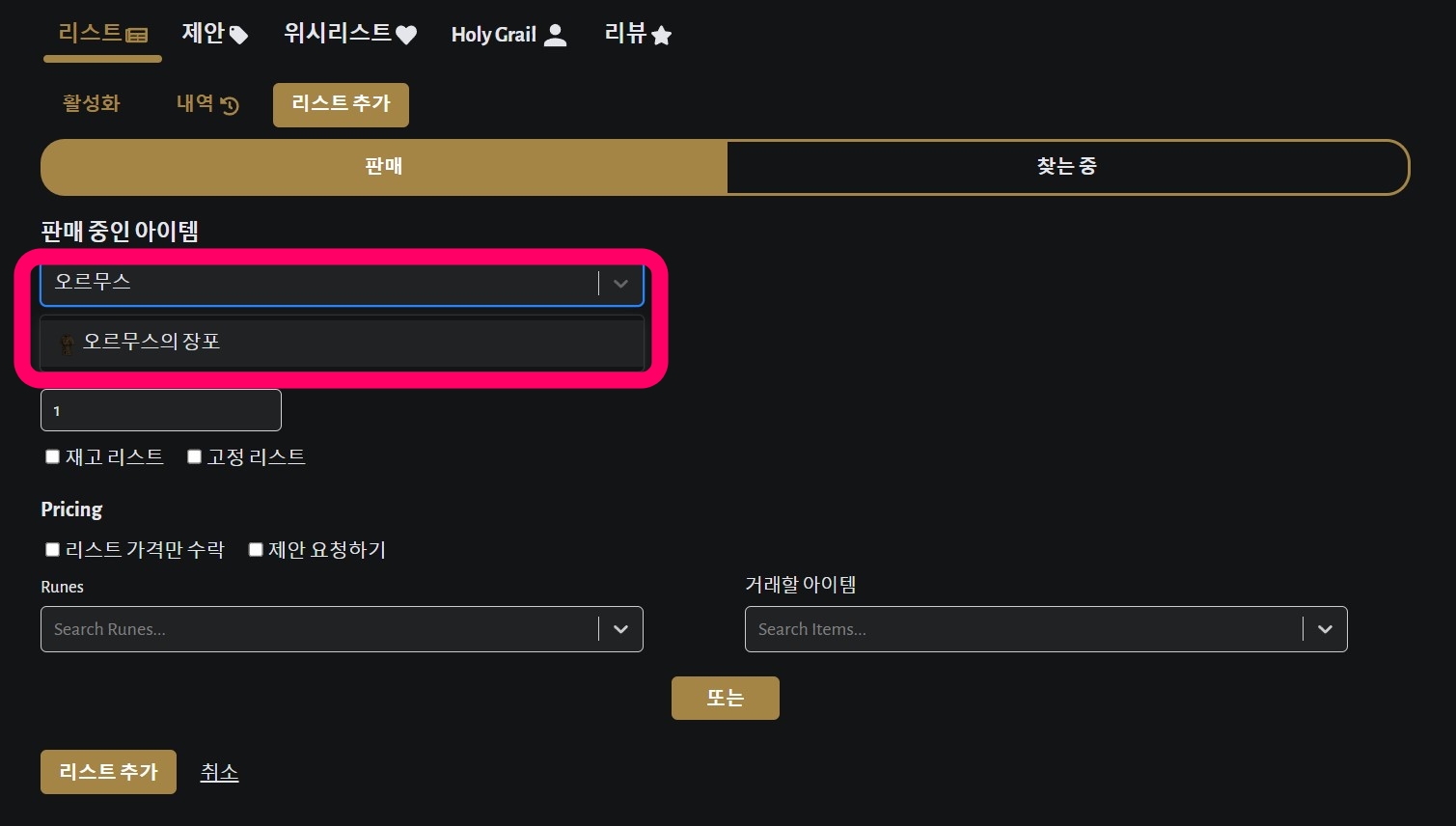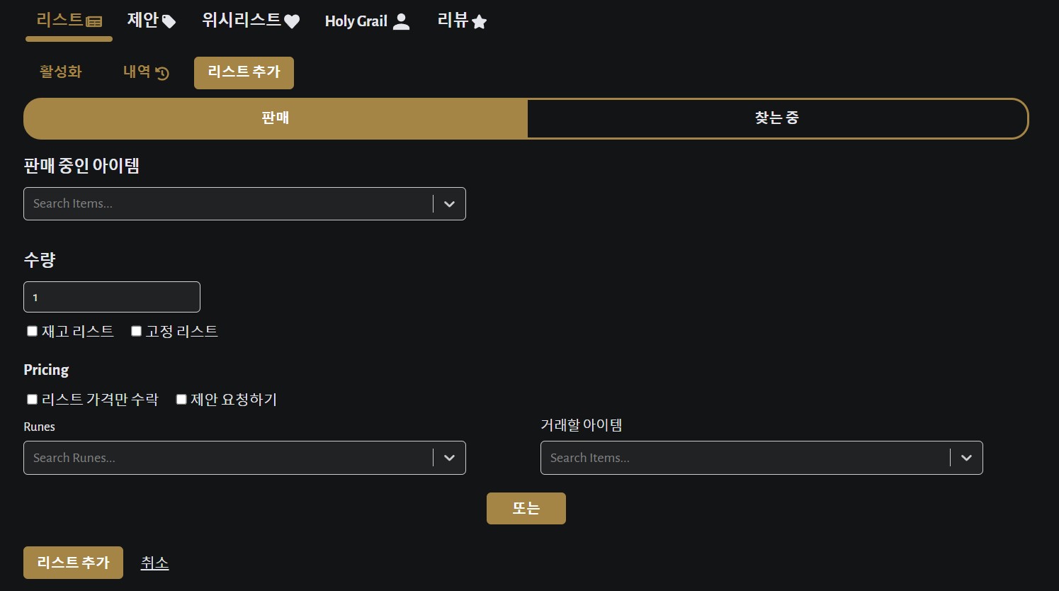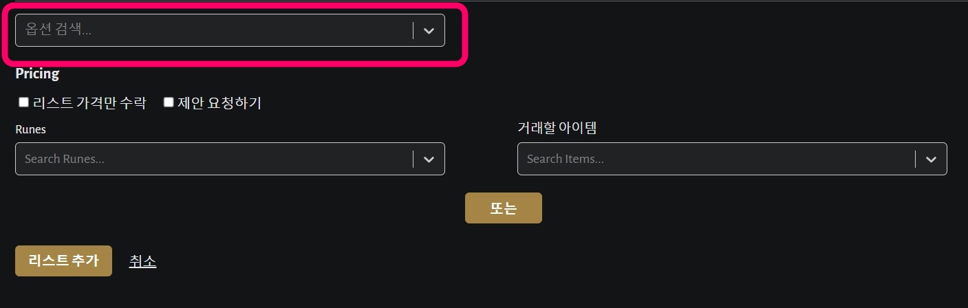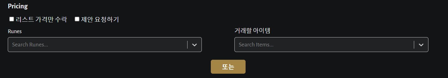 리스트 가격만 수락한다고 체크하면 제안하기는 없어지고, 제안 요청하기를 체크하면 룬과 아이템이 있는 부분이 없어집니다. 굉장히 좋은 아이템이라고 한다면 리스트 가격만 수락하거나, 또는 어느 룬 정도 기준을 잡아두고 제안을 받는 것도 좋은 방법입니다.