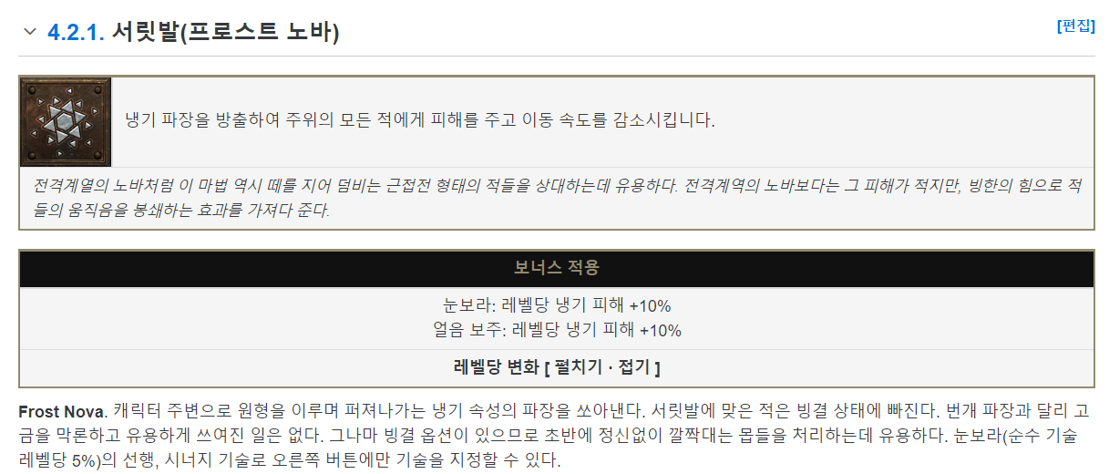 여기에 서릿발과 같은 스킬명을 영문으로 찾는 게 중요한데, 이건[디아블로 2 레저렉션 소서리스 나무 위키]에서 냉기 기술 부분에서 찾아보고 있습니다. 다른 직업들의 스킬도 비슷하게 검색해서 찾을 수 있습니다.