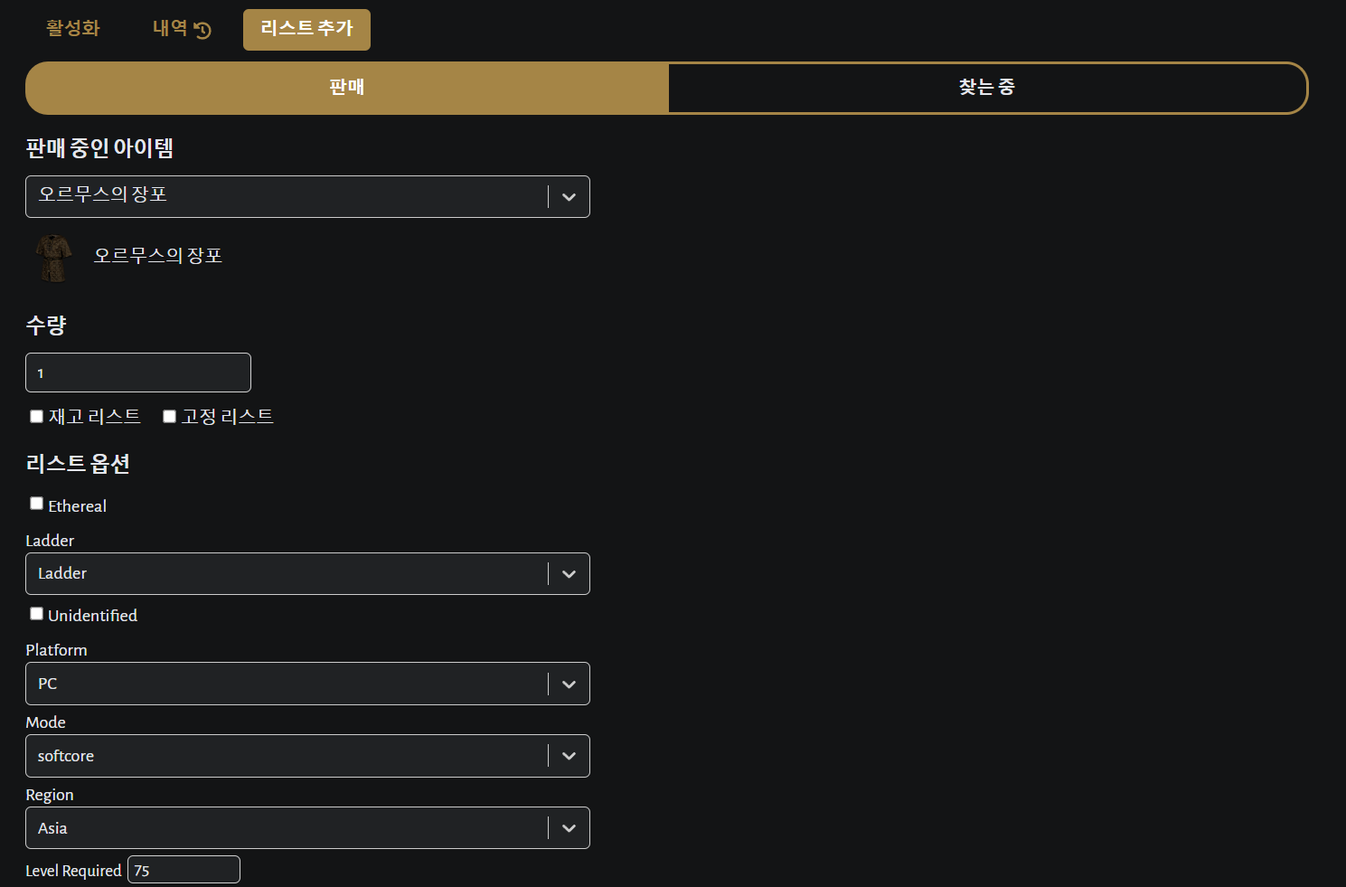 먼저 판매 중인 아이템 아래에 [오르무스의 장포] 아이템을 검색합니다. 오르무스까지만 작성해도 자동완성이 되기 때문에 아이템 검색은 굉장히 쉽습니다. 한국어로 언어 설정을 변경해 놓았기 때문에 한국어로 아이템을 검색해도 찾을 수 있습니다.