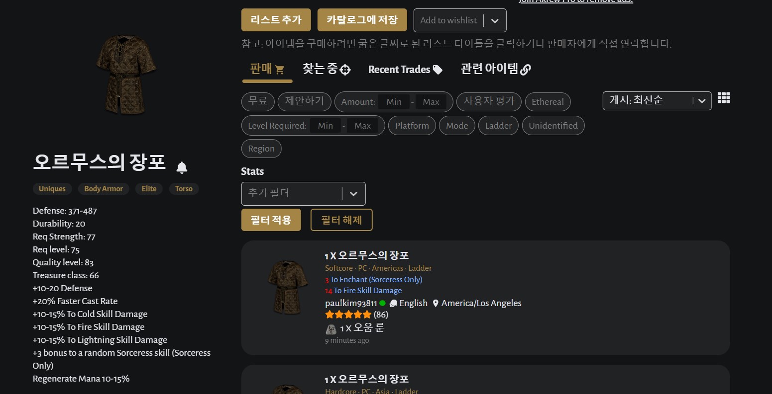 그러면 판매하는 사람들이 올려놓은 오르무스의 장포가 쭉 나옵니다. 왼쪽에는 아이템 옵션들이 영어로!! 영문으로!! 작성이 되어있습니다. 대부분 사람들이 아이템 등록을 할 때, 유니크나 세트 아이템 같이 수치들이 변동되는 것만 옵션으로 등록하기 때문에 그것만 쏙쏙 뽑아서 올리면 됩니다.