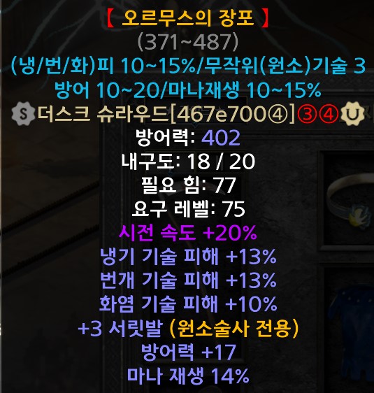 제가 가진 아이템 변동 옵션을 보고 설명해 드리자면, 오르무스의 장포는 냉기기술을 주로 사용하는 소서리스가 사용하는 갑옷입니다. 냉기, 번개, 화염 기술 피해 변동 옵션을 등록하고, 무작위로 붙는 원소술사 스킬이 무엇인지만 옵션으로 등록해 주면 됩니다. 시전속도 20%는 어떤 오르무스의 장포가 나와도 고정으로 붙는 옵션이기 때문에 굳이 등록할 필요가 없습니다.