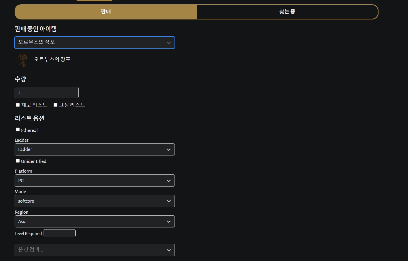 먼저 판매 중인 아이템 아래에 [오르무스의 장포] 아이템을 검색합니다. 오르무스까지만 작성해도 자동완성이 되기 때문에 아이템 검색은 굉장히 쉽습니다. 한국어로 언어 설정을 변경해 놓았기 때문에 한국어로 아이템을 검색해도 찾을 수 있습니다.