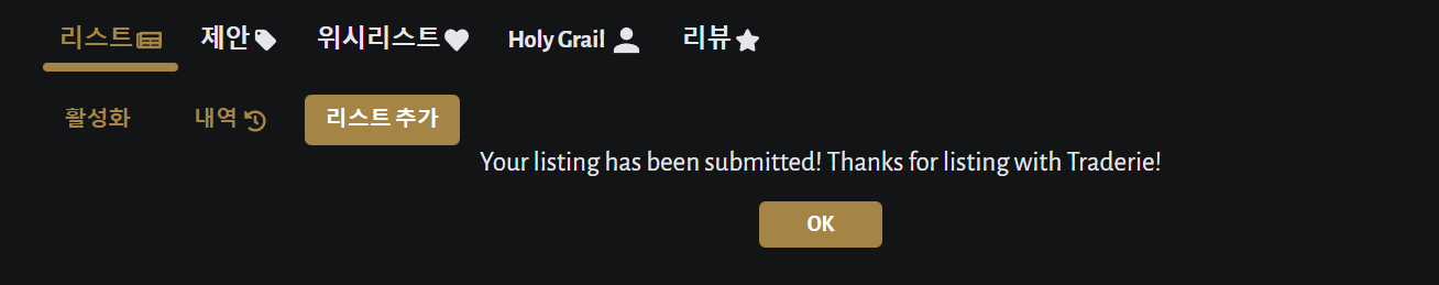 가격을 정하고 아래의 [리스트 추가] 버튼을 누르면 리스팅이 잘 되었다고 뜹니다.