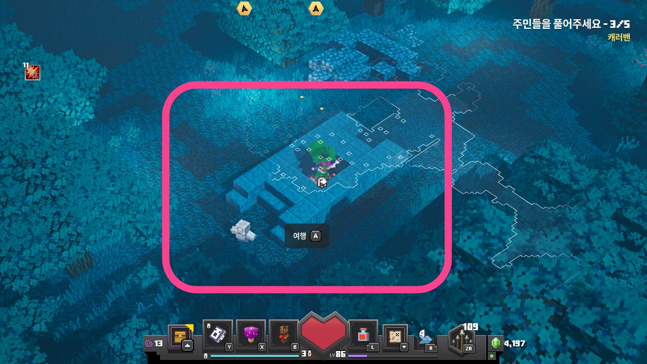 주민 5명을 풀어주어야 하는 미션이 생기면, 사진상의 지도 위치를 잘 보시고 화살표 끝점 쪽으로 쭉 이동해주세요