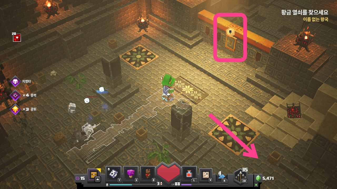 황금열쇠를 찾는 곳까지 진행해주세요. 석상을 누르면 벽이 내려가면서 황금열쇠가 있는 곳으로 길이 열려요. 황금열쇠는 안주워도 되니 옆방에 있는 몬스터들을 처리해주세요