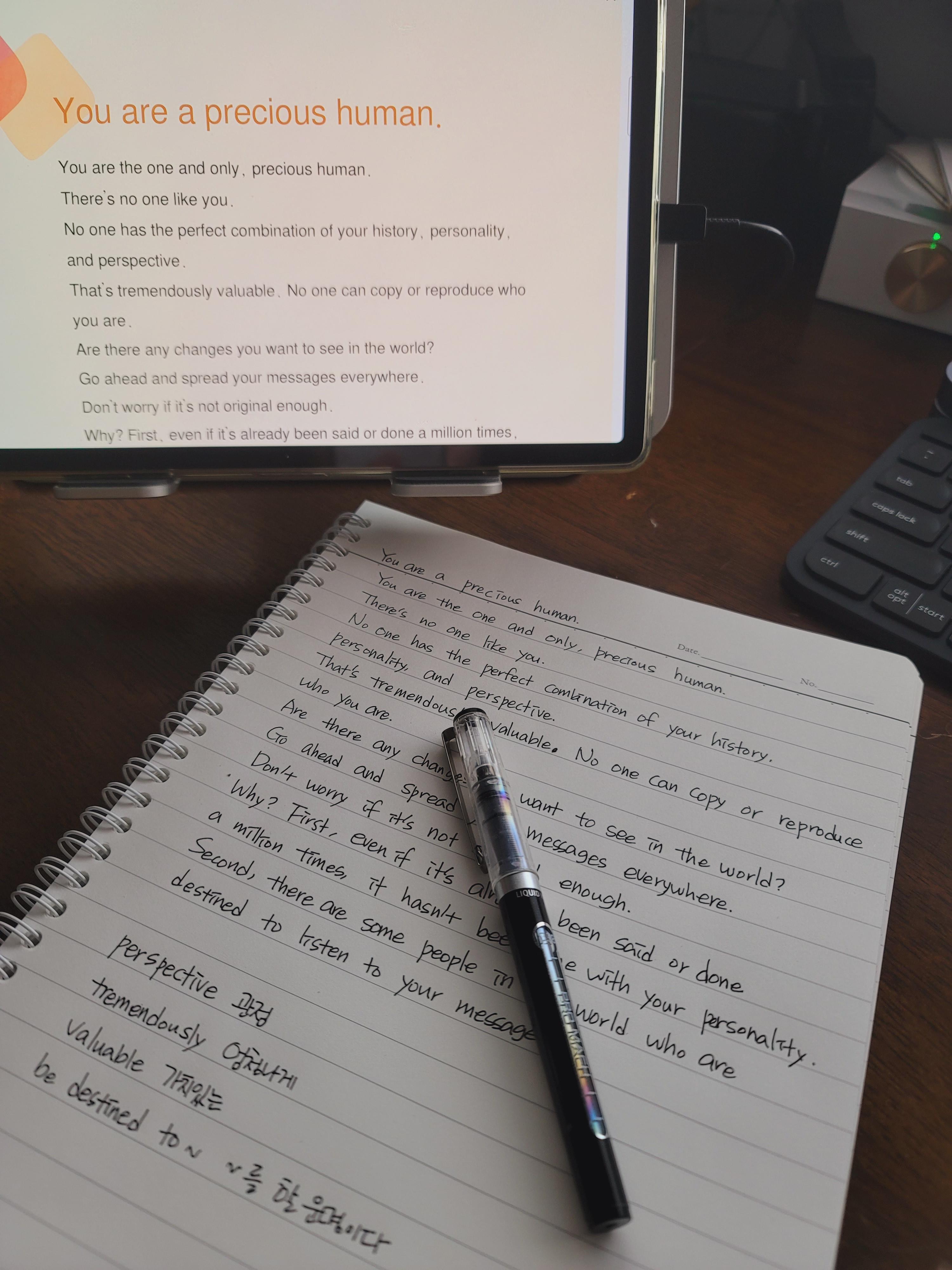 쓰다 보니 한번 더 읽게 되는 부분도 있고, 생각을 하게 되는 부분도 있었습니다. "You are the one and only. There's no one like you."라는 부분이 머릿속에서 자꾸 떠나질 않았습니다. 어쩌면 이런 말을 책이 아닌 누군가에게 듣고 싶었는지도 모르겠습니다. 이 책을 다 필사하고 나서 나의 영어실력이 엄청나게 좋아지는 것이 목표가 아니라, 내가 좋아하고 재미있게 하는 일이 습관이 되어 내가 다른 일을 하거나 다른 어떤 무언가를 하게 될 때 긍정적인 도움이 되기를 바랍니다.