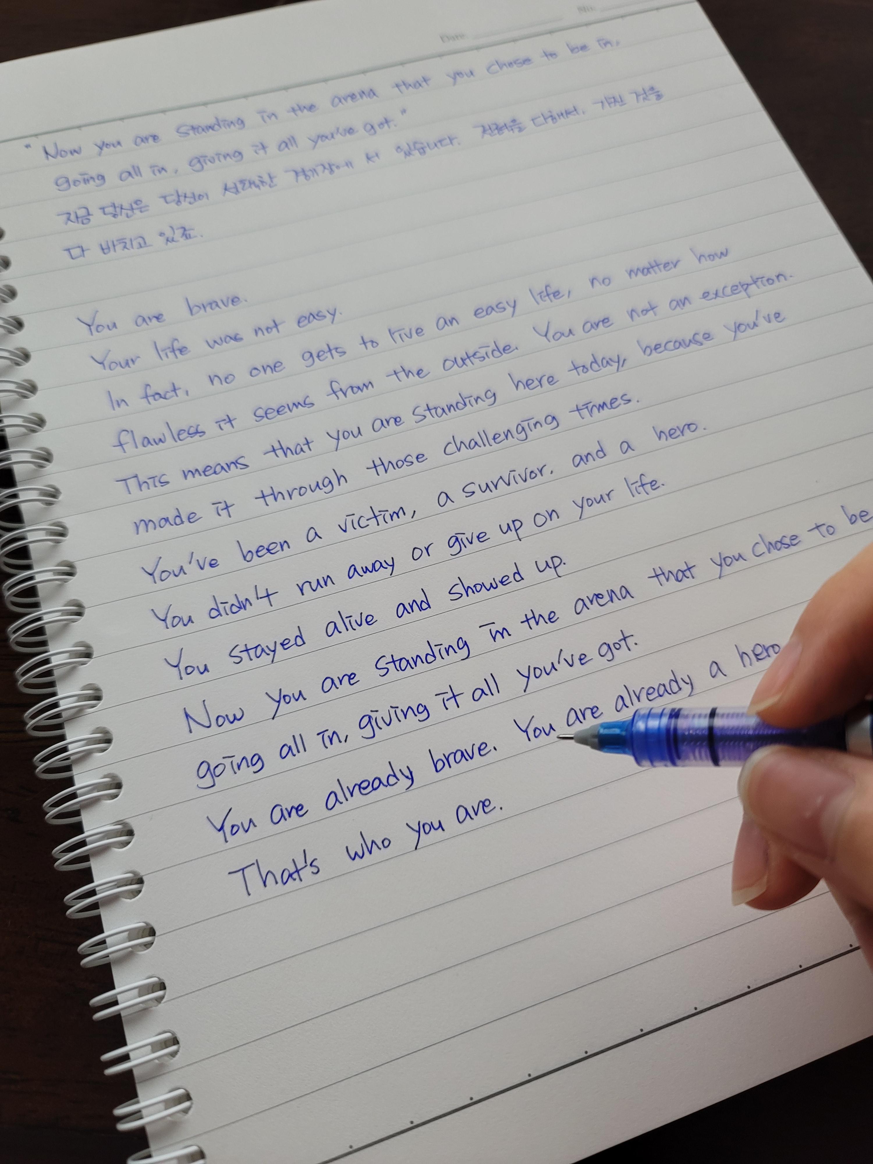 파란색 펜으로 썼지만, 다이소에서 구매했던 만년필로도 써보고 싶어 다시 한번 더 써보았습니다. 한 번을 쓰던, 두 번을 쓰던 쓰는 것은 쓰는 이의 마음대로이기 때문입니다. 이렇게 손으로 직접 쓰면서 느낀 점은 그동안 메신저로는 자동완성이 되기 때문에 눈으로는 알지만 직접 쓰려면 이게 맞는지 헷갈렸던 부분이 간혹 있었는데 그런 점이 조금씩 바뀌는 것 같다는 느낌이 들었습니다.