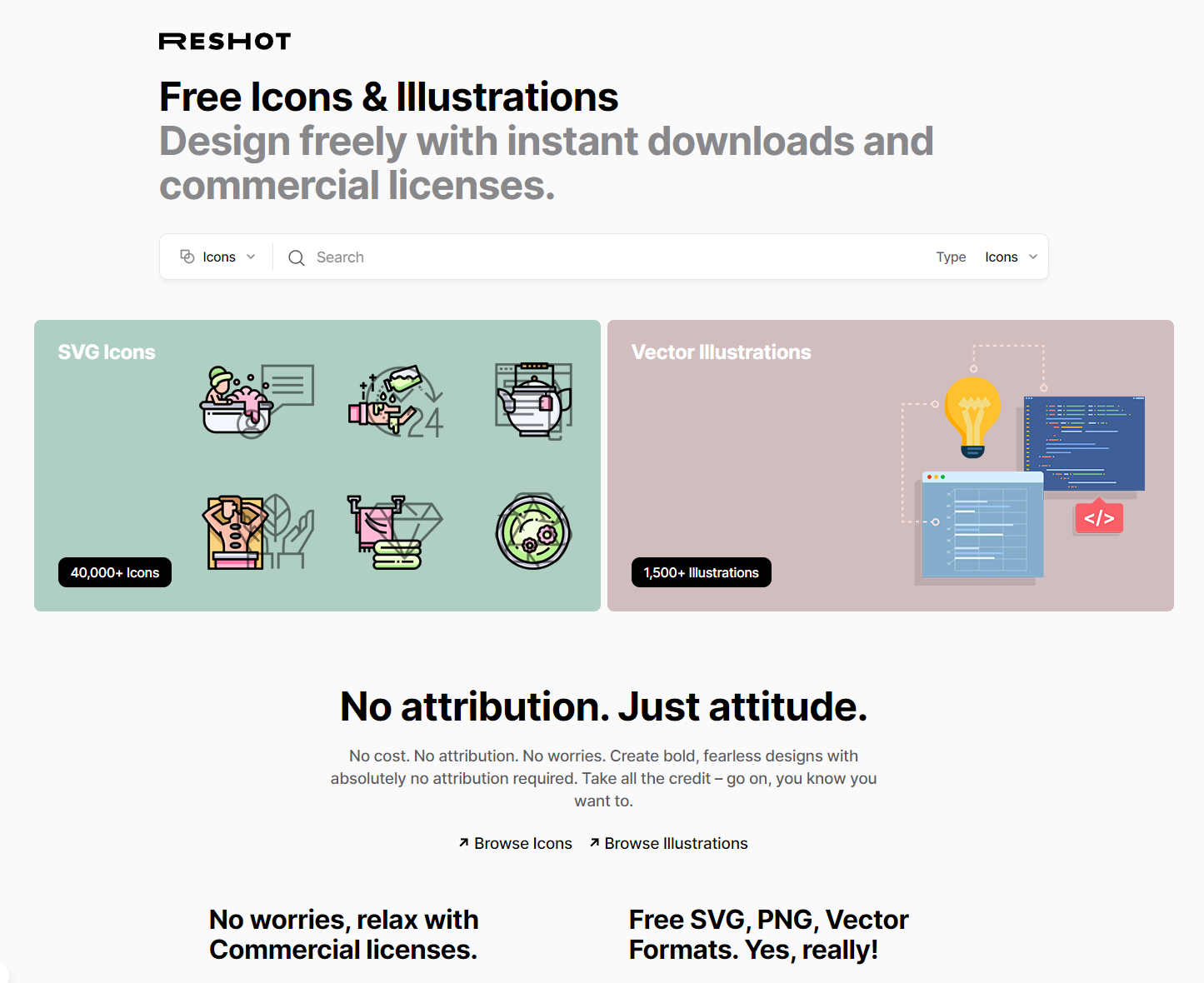 아홉 번째로 소개해드리는 사이트는 리샷입니다. 무료 SVG 아이콘과 벡터 일러스트레이션을 저작권 없이 무료로 다운로드할 수 있습니다. 디자이너들이 디자이너들을 위해 만들었다는 리샷은 다양한 아이콘을 개별로 또는 세트로 다운로드할 수 있습니다.