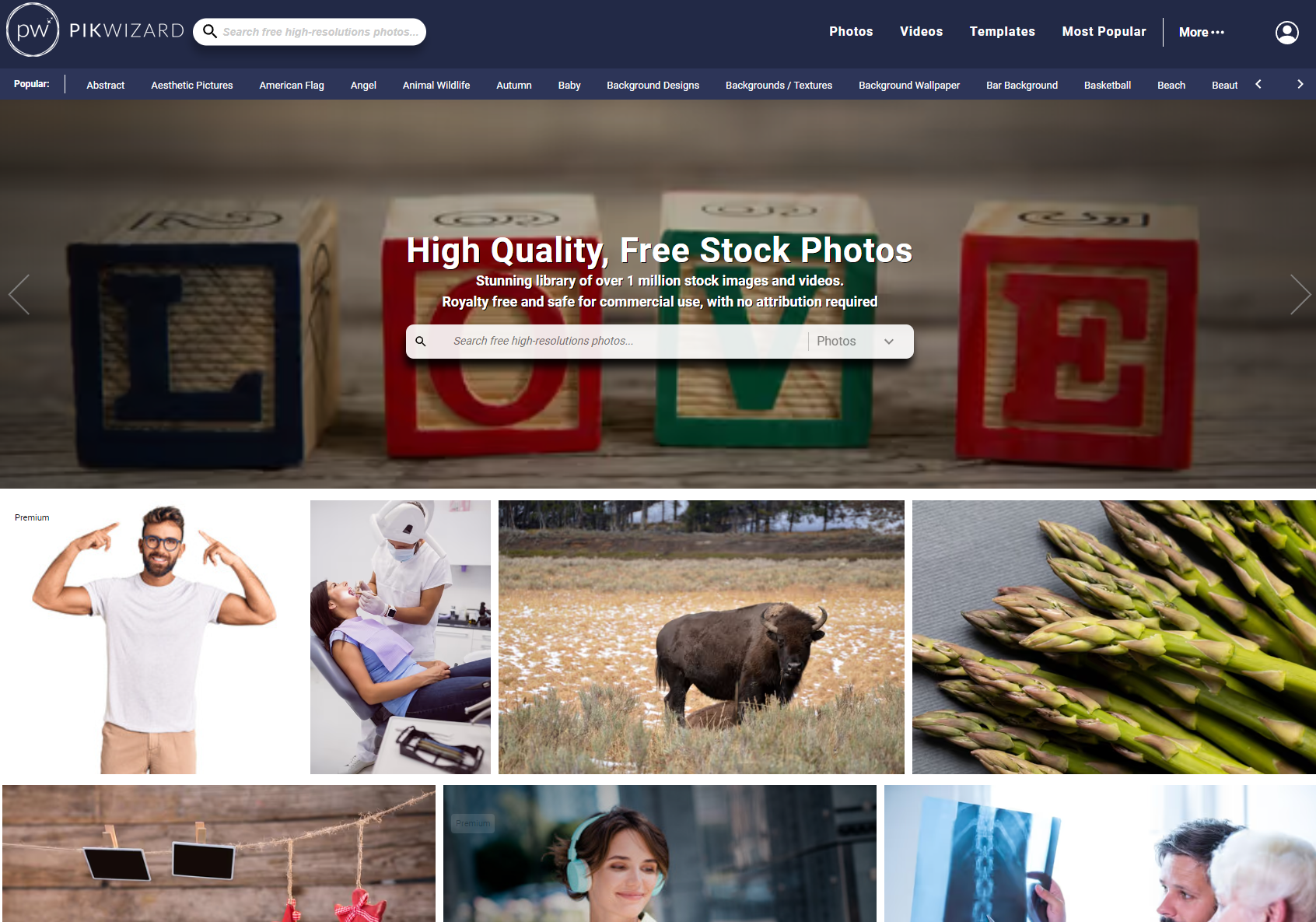 네 번째로 소개해드리는 사이트는 픽위자드입니다. 고퀄리티의 이미지부터 동영상까지 저작권 없이 사용가능한 많은 리소스들을 제공하고 있습니다. 디자인 위자드라는 이미지 편집 사이트도 함께 운영하고 있기 때문에 이미지를 바로 편집하여 저장할 수 있다는 특징이 있습니다.