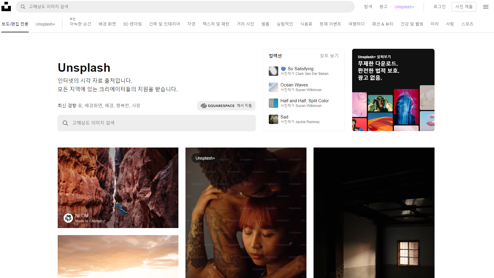 세 번째로 소개해드리는 사이트는 언스플래쉬입니다. 픽사베이 다음으로 유명한 무료 이미지 사이트입니다. 사진의 퀄리티가 뛰어나기 때문에 조금 신경을 써야 하는 자료라면 언스플래쉬를 이용하여 이미지를 찾는 것도 좋은 방법입니다.