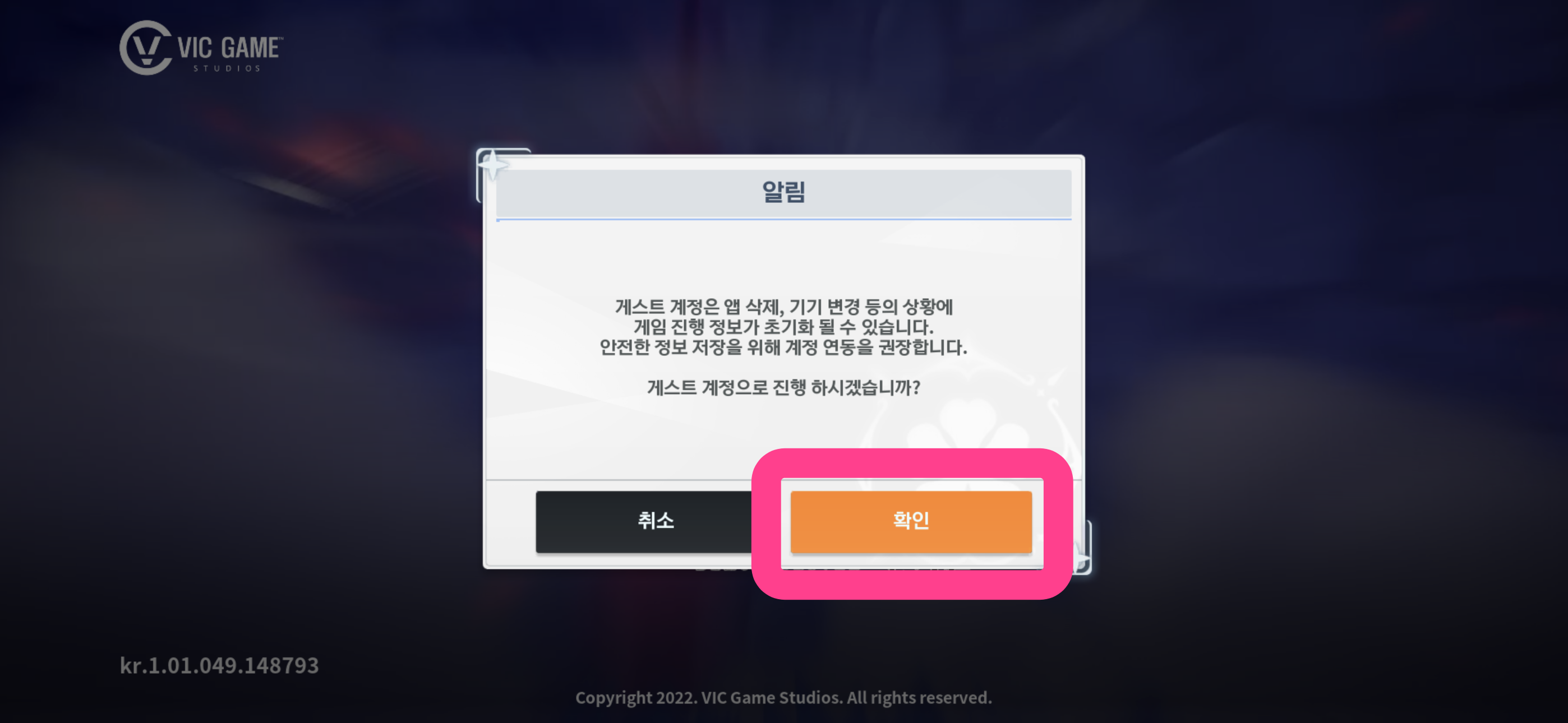 먼저, 리세마라를 염두에 두고 있는 분들이라면 구글이나 애플과 같은 계정을 연동하지 않고 게스트로 시작해야 합니다. 연동을 하게 되면 리세마라를 할 수 없습니다. 반드시 게스트 계정으로 로그인해야 합니다.