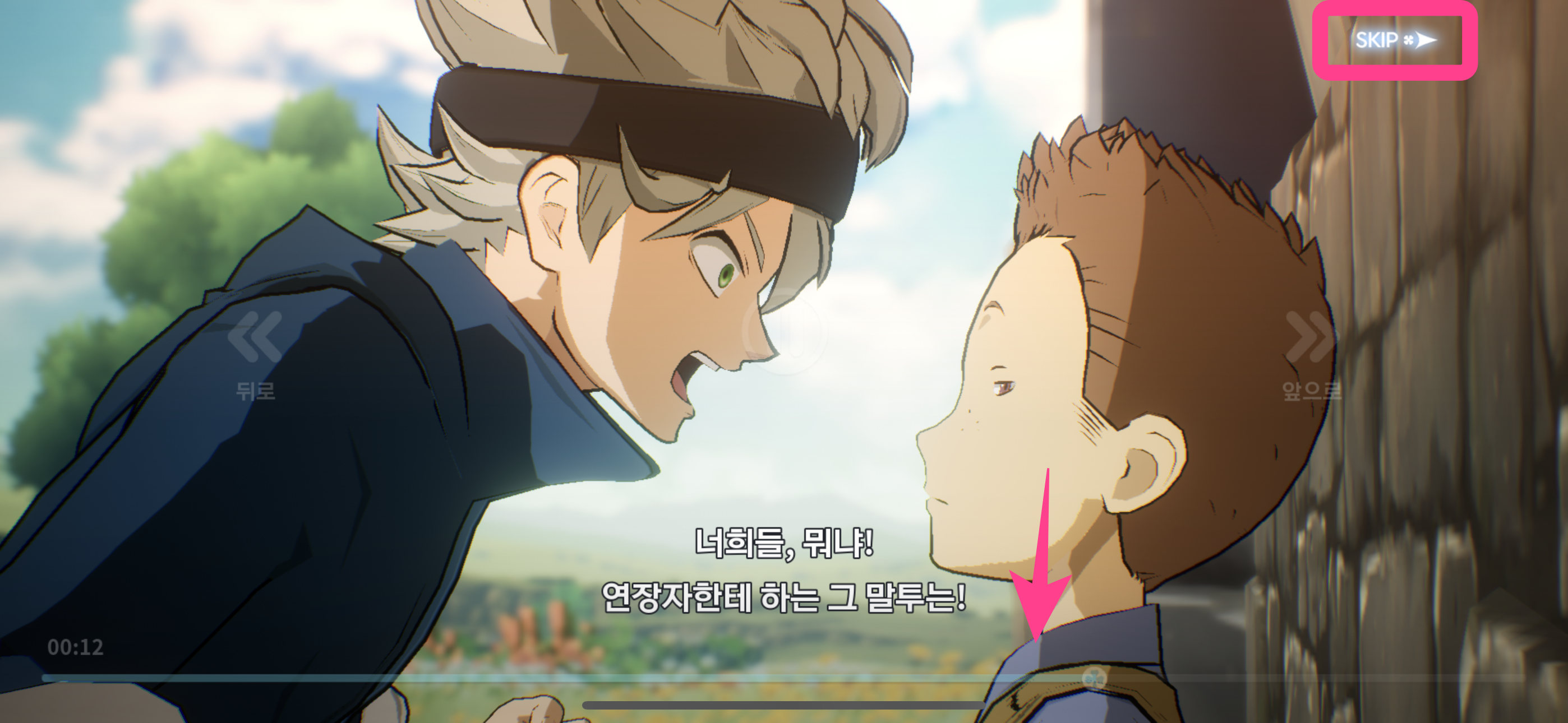 계정을 게스트로 선택한 후 플레이를 진행하다 보면 일정 퀘스트를 완료한 후, 캐릭터 소환을 할 수 있습니다. 스토리 진행 중 영상스킵에 대한 팁을 드리자면, 동영상은 오른쪽 상단에 있는 SKIP 버튼을 누르면 가능합니다. 스킵이 되지 않는 영상의 경우에는 아래쪽의 바를 끝까지 밀어 영상을 빠르게 건너뛸 수 있습니다. 지나간 영상은 [스토리 다시 보기]에서 다시 감상할 수 있습니다.