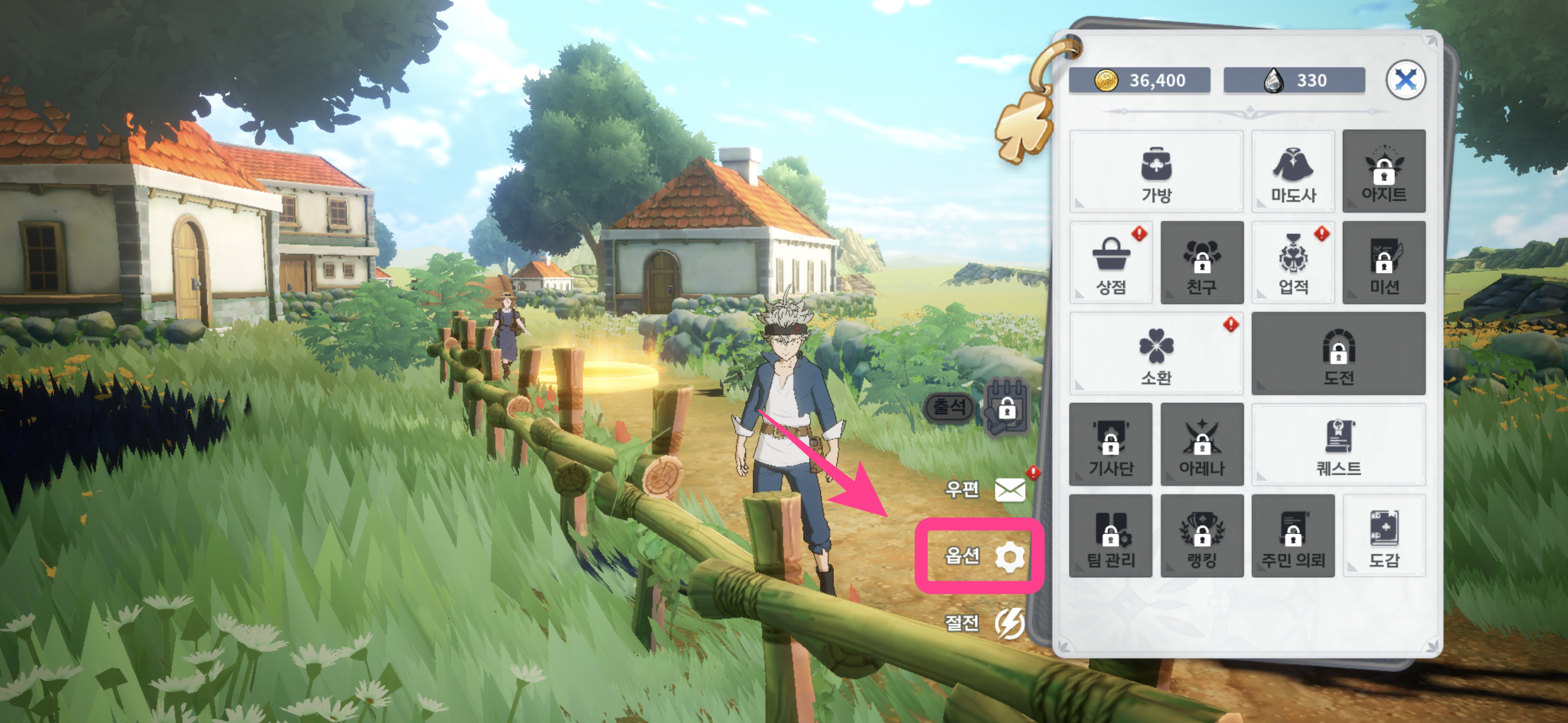만약 소환된 캐릭터가 마음에 들지 않거나, 원하는 것을 뽑지 못했을 때에는 리세마라를 할 수 있습니다. 블랙 클로버의 리세마라 방법은 굉장히 간단합니다. 먼저 화면 상단에 있는 [클로버]를 눌러준 후, 나타나는 창 옆의 조그만 [옵션] 버튼을 클릭해서 들어가 줍니다.