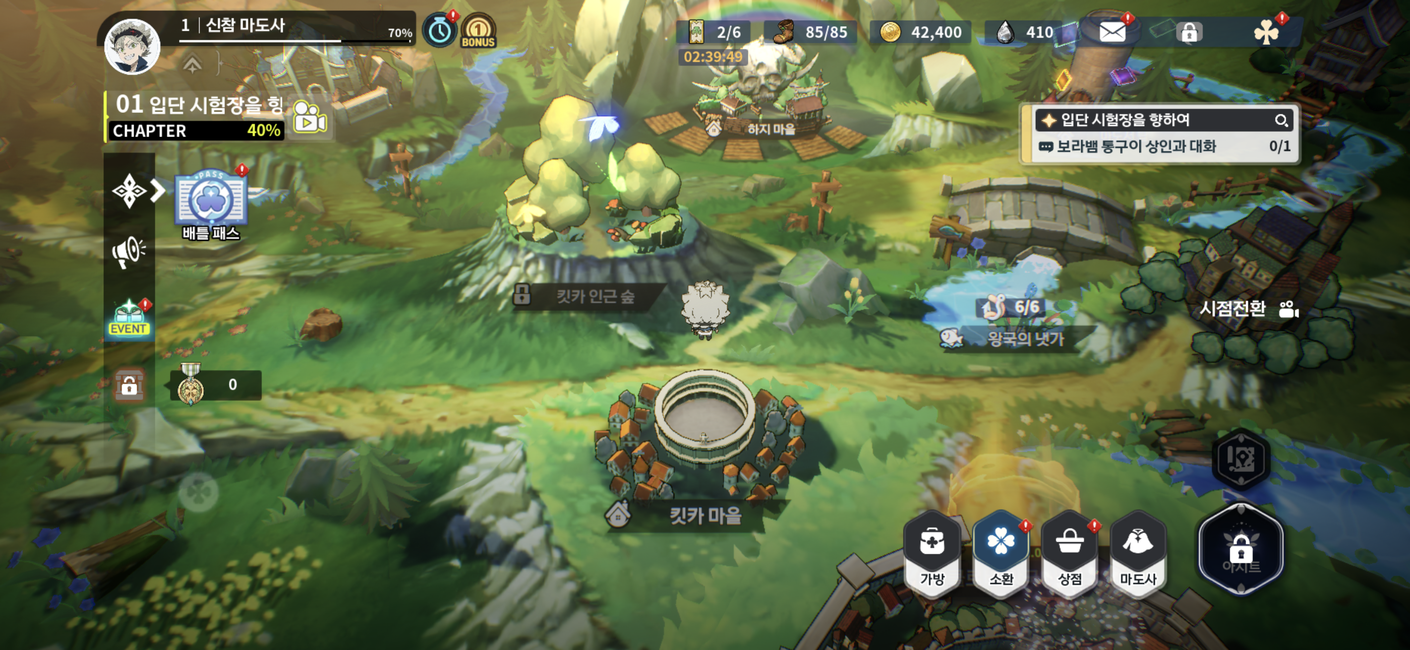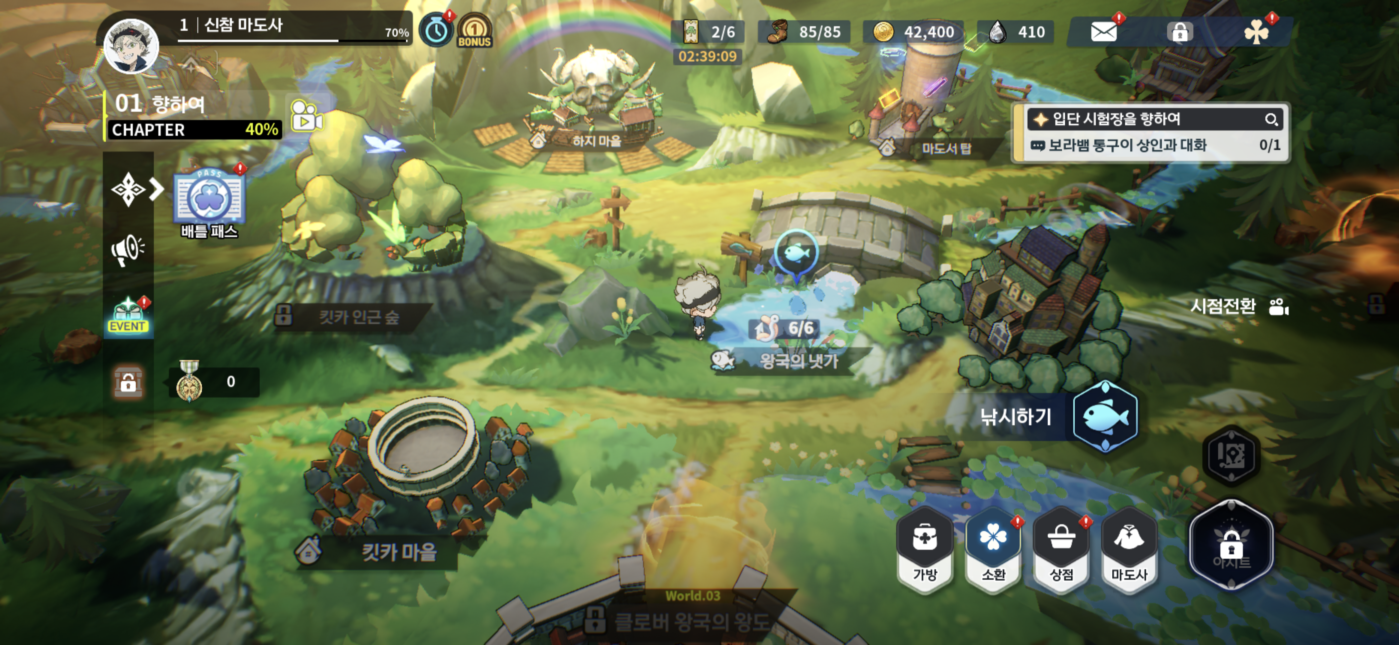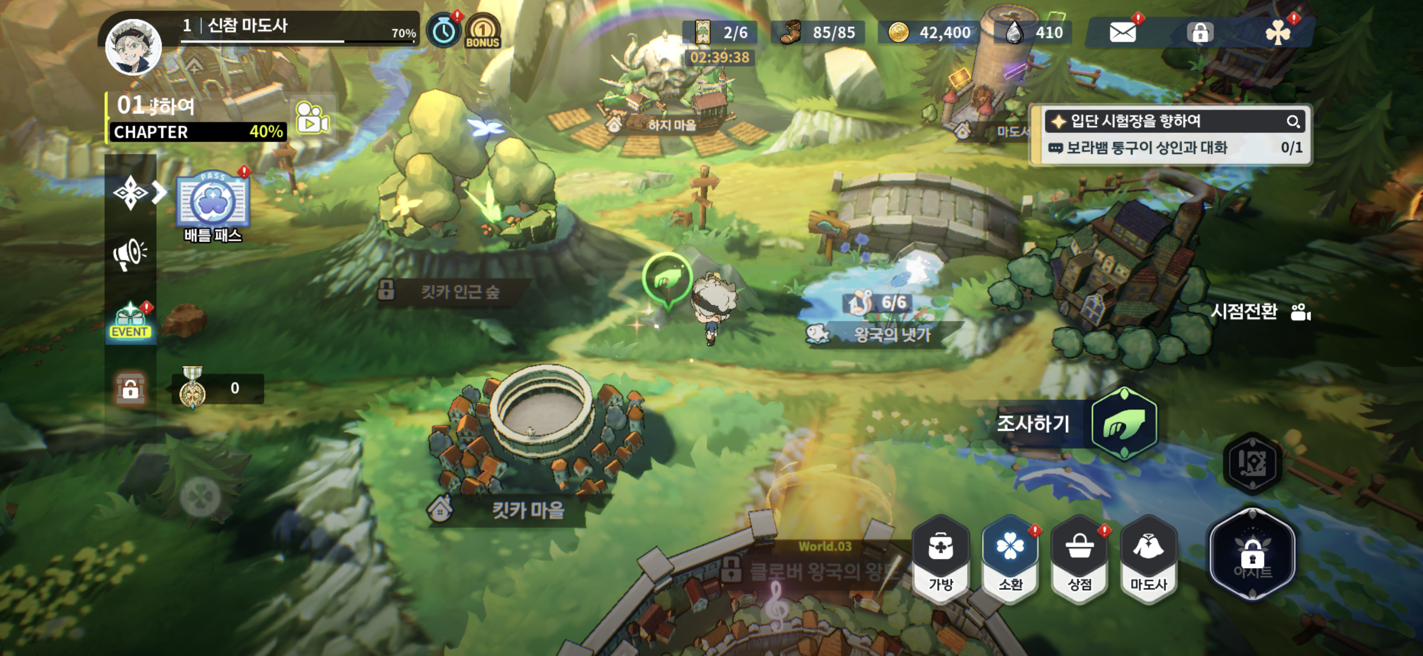 턴제형 모바일 게임을 플레이할 때 오토기능으로 편하게 할 수 있다는 장점이 있긴 하지만, 편하게 플레이하는 것이 반복되면 지겨워질 수도 있다는 단점이 존재합니다. 블랙 클로버 게임을 플레이하면서 조금 신선했던 것은 캐릭터가 월드맵에 들어가서 원하는 대로 자유롭게 움직일 수 있다는 것이었습니다. 이곳저곳을 뛰어다니기도 하고 낚시도 할 수 있었습니다.
