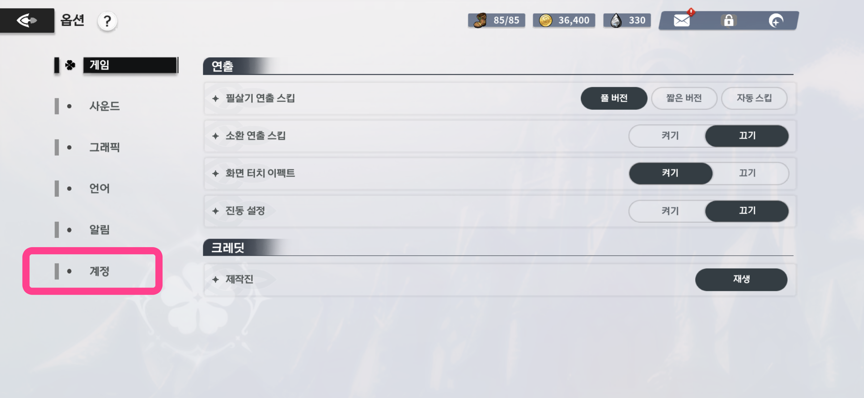 옵션에 들어왔다면 [계정]을 클릭해 [계정초기화]를 눌러줍니다. 그러면 간단하게 계정이 초기화되어 처음부터 다시 시작하게 됩니다. 데이터를 다시 받아야 하는 번거로움이 없이 진행이 가능합니다. 또한 데이터 이어하기도 지원하기 때문에 코드만 알고 있다면 간단히 코드만 입력하여 진행 상황을 이어할 수 있습니다.