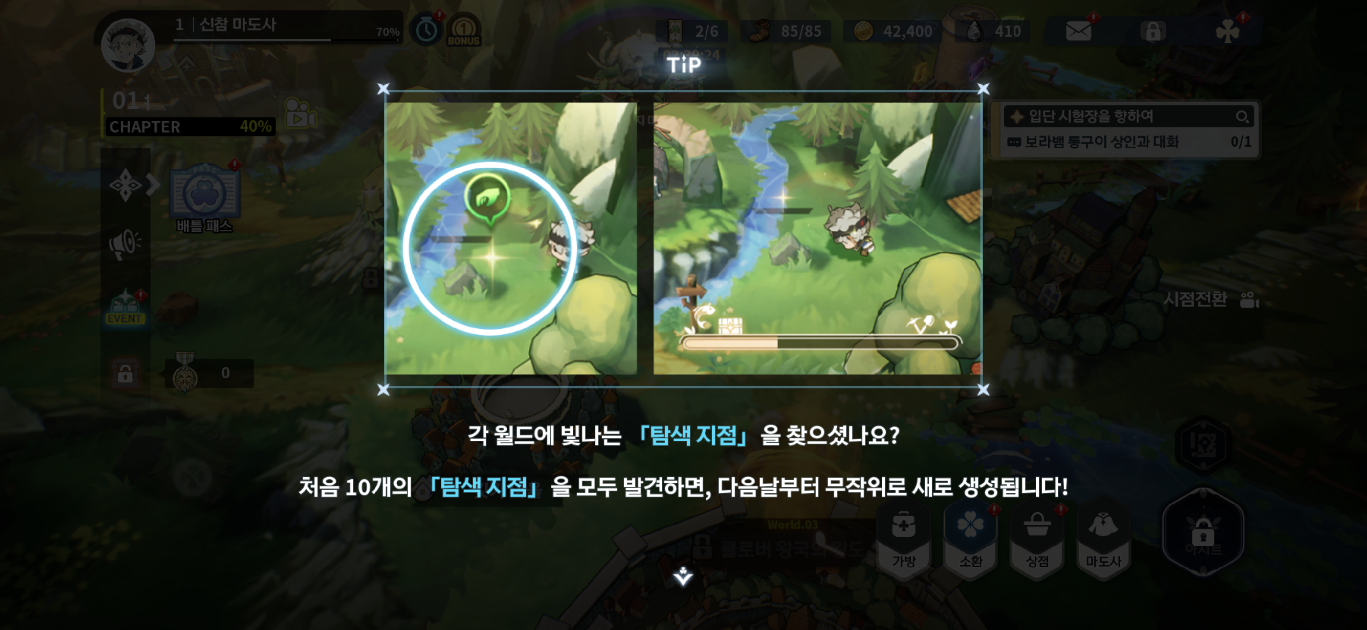 또한 월드맵을 돌아다니다 보면 풀이나 나무, 구석진 곳의 반짝거리는 것에서 손 모양의 아이콘이 생기는데, 이것을 조사하여 월드에 있는 탐색지점을 찾으러 다녀볼 수도 있습니다. 처음 10개의 탐색지점을 모두 발견하게 되면, 다음날부터 무작위로 새로 생성된다고 하니 매일 찾는 재미가 쏠쏠할 것 같습니다.
