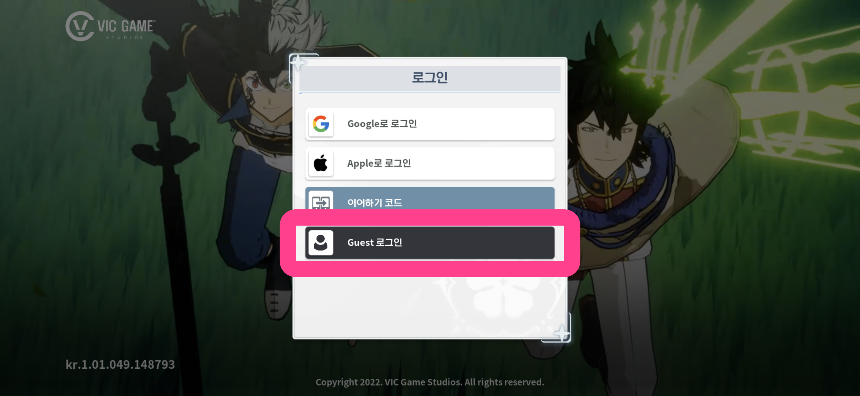 먼저, 리세마라를 염두에 두고 있는 분들이라면 구글이나 애플과 같은 계정을 연동하지 않고 게스트로 시작해야 합니다. 연동을 하게 되면 리세마라를 할 수 없습니다. 반드시 게스트 계정으로 로그인해야 합니다.