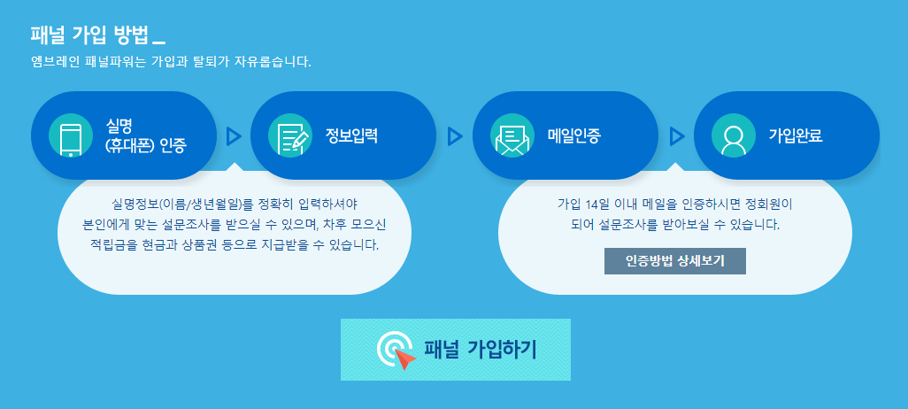 먼저 엠브레인 홈페이지의 회원가입을 해 줍니다. 회원가입의 순서는 [약관동의] → [휴대폰 인증] → [아이디와 패스워드 등의 정보입력] → [메일 인증] 순서입니다. 여타 다른 사이트들과 마찬가지로 회원가입 순서는 거의 비슷합니다.