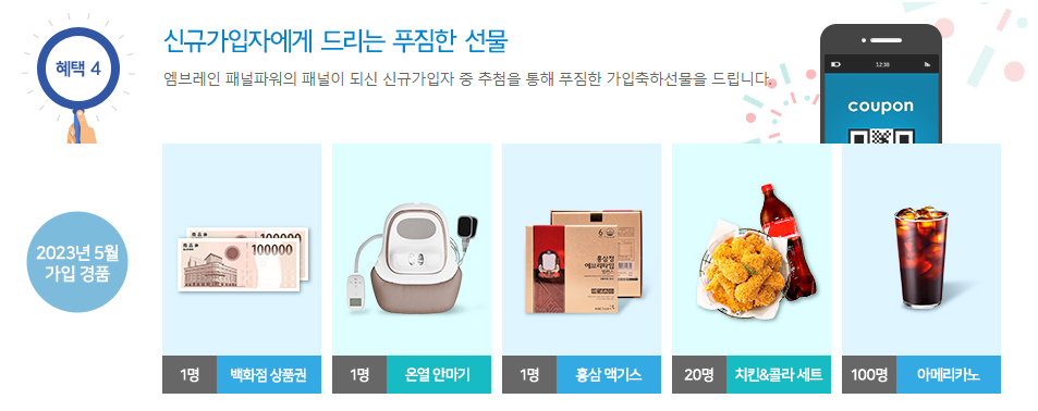 ● '23.5월 추첨 경품(123명): 백화점 상품권(1명), 온열 안마기(1명), 홍삼 액기스(1명), 치킨&콜라 세트(20명), 아메리카노(100명)