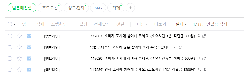 메일 인증까지 진행하고 나면 거의 매일(?) 설문조사에 참여할 수 있게 됩니다. 설문 조사의 종류는 매우 다양합니다. 그리고 온라인이나 모바일로 하는 설문뿐만 아니라 쇼핑 패널이나 좌담회 등의 여러 가지 활동으로도 적립금을 모을 수 있습니다.
