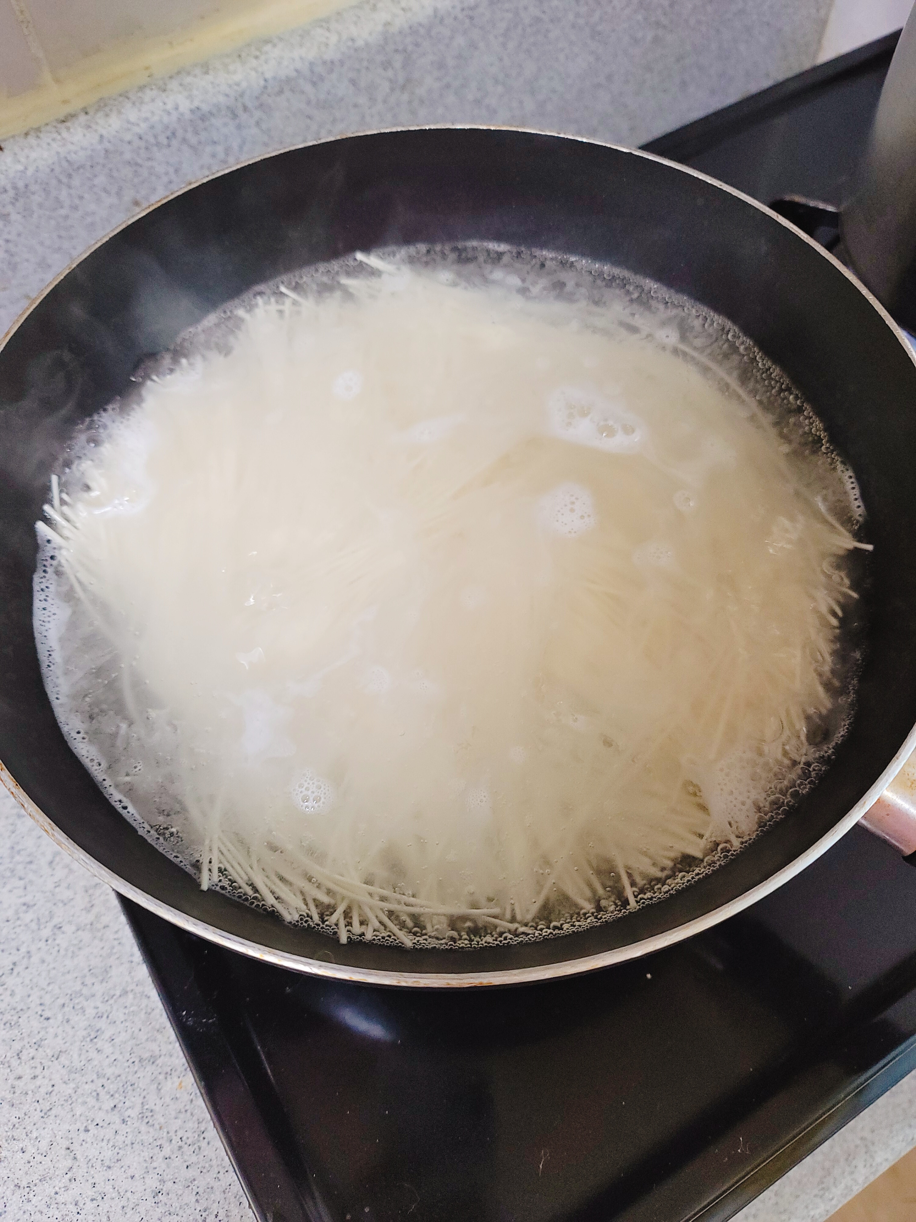 면을 삶을 때는 소면 봉지에 쓰여있는 대로 시간을 지켜주는 것도 굉장히 좋은 방법이지만, 저는 중간중간 한 줄씩 빼내서 찬물에 헹궈서 먹어본답니다. 찬물에 헹궈서 먹어보는 이유는 그냥 꺼내서 먹어보면, 분명히 먹어봤을 땐 적당히 익은 느낌이었는데 헹구고 보니 덜 익은 거 같은 느낌이 들기 때문입니다. 그래서 아예 한 줄씩 빼내서 찬물에 헹궈서 먹어본답니다. 사람마다 적당히 익었다는 정도가 다 다르니 취향껏 익혀주시면 될 것 같습니다. 다 익었다 싶으면 채반에 받쳐 찬물에 빡빡 씻어 헹구어 줍니다. 그리고 물기를 살짝 빼 놓아주세요.