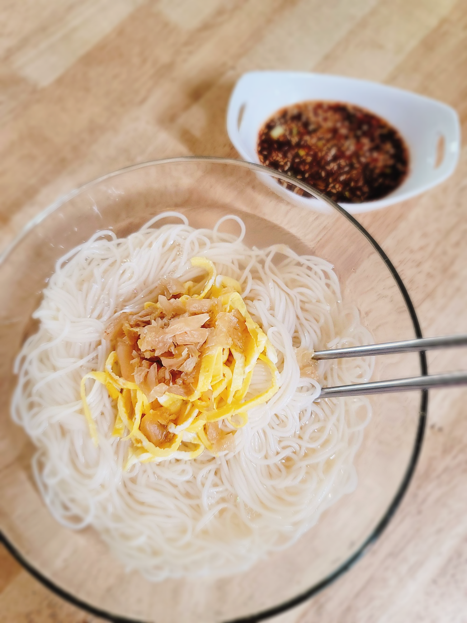 원래대로라면 멸치를 우려 육수를 끓이는 시간에 고명도 만들고 양념장도 만들고 소면도 삶았었는데, 육수를 우려내는 시간이 확 단축되다 보니 육수가 조금 식었습니다. 너무 오래 끓이면 졸아서 짤까 봐 계속 끓이지 않았기 때문입니다. 다음번엔 시간배분을 잘해서 만들어봐야겠습니다. 확실히 마트에서 사서 만든 육수가 조리시간을 확 단축시켜 주어 좀 더 빠르게 만들 수 있는 것 같습니다. 건져 놓은 면은 뜨거운 육수에 한번 담갔다 빼주면 좀 더 따뜻하게 먹을 수 있습니다. 이걸 토렴이라고 합니다. 원래는 국밥을 말 때 사용하는 방법이지만 차가워진 면에 적용해서 드시면 좋을 것 같습니다.