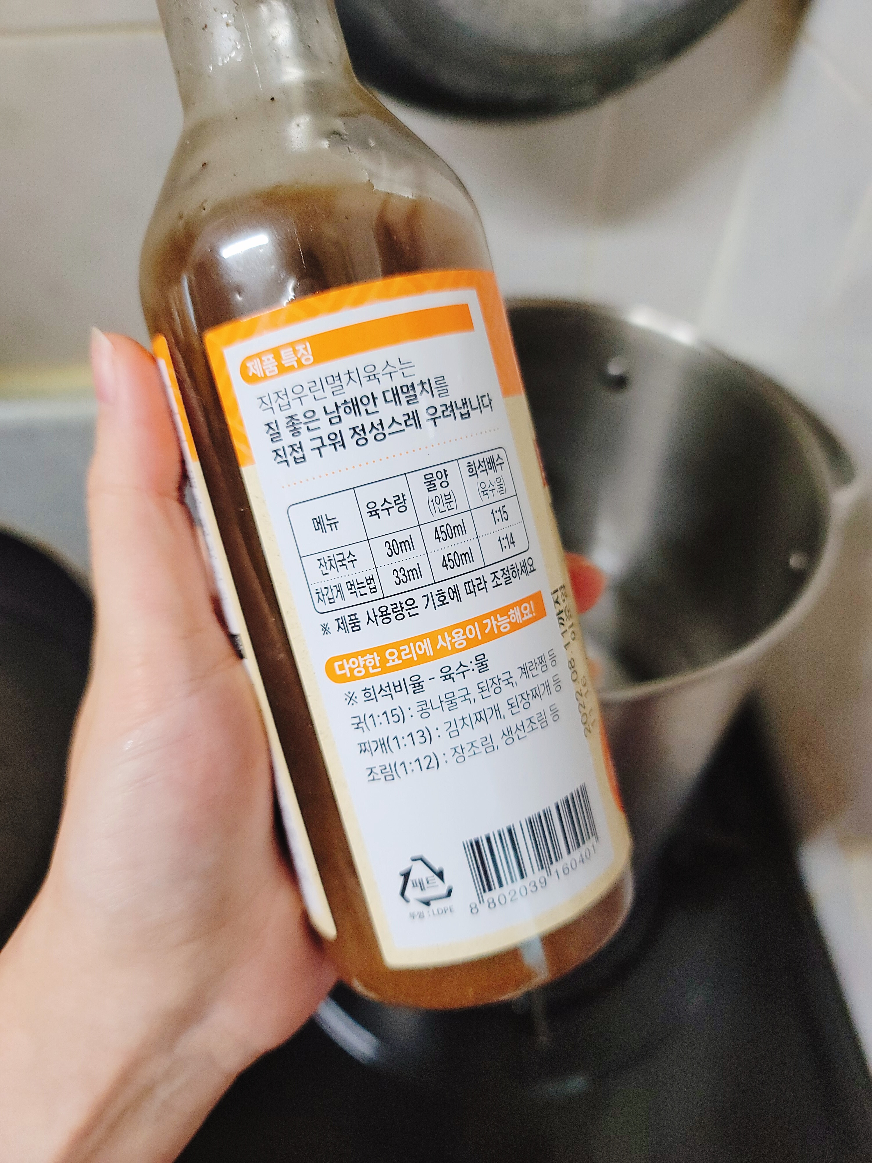 육수 만들기가 제일 쉬웠습니다. 냄비 두 개를 두고 하나는 소면을, 하나는 육수를 끓일 용도로 사용했습니다. 원래는 스파게티 면을 삶는 파스타포트지만, 소면을 끓이면 소면이 구멍사이로 빠질까 봐 이곳에 육수를 끓였습니다. 육수와 물의 비율은 1:15라고 쓰여있습니다. 육수 30ml : 물 450ml 비율로 넣어서 끓여주었습니다. 저는 3인분을 준비했기에 물 1.5리터 정도에 육수 90ml 정도 사용했답니다. 멸치 육수 국물 색이 그럴듯해 보입니다. 맛이 좀 밍밍할 줄 알았는데, 직접 우린 거랑 별 차이가 없는 것 같았습니다.