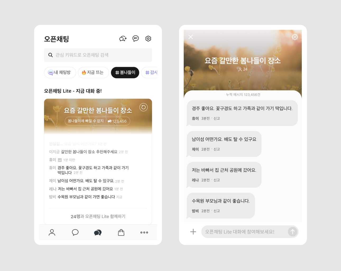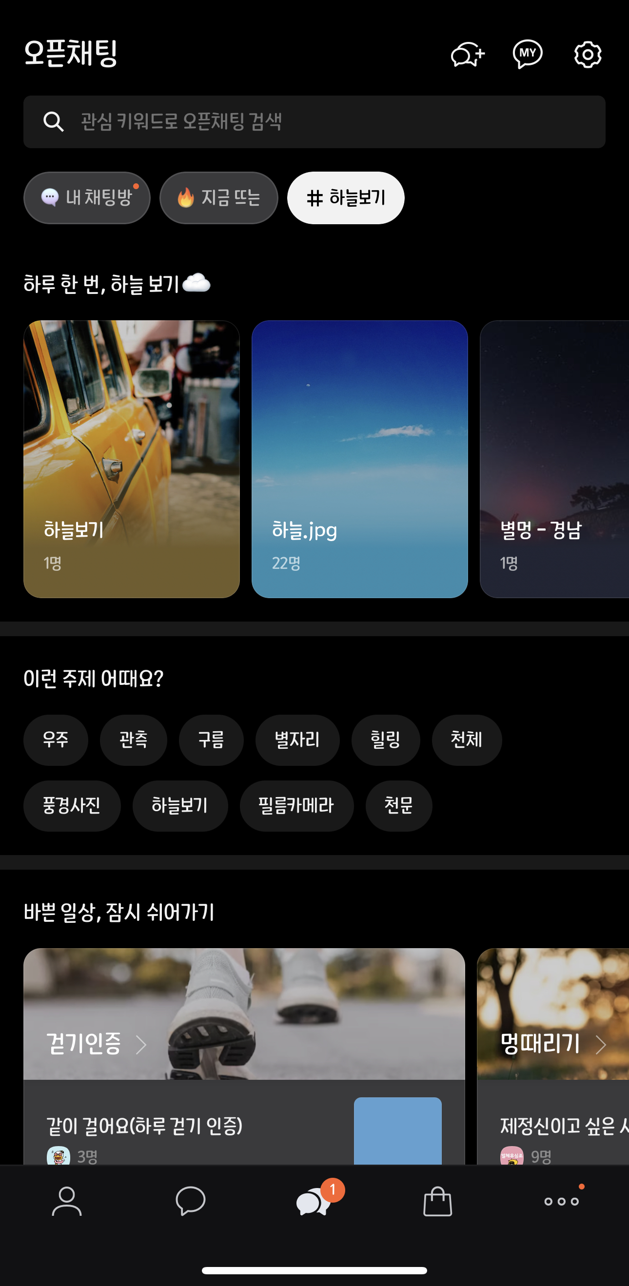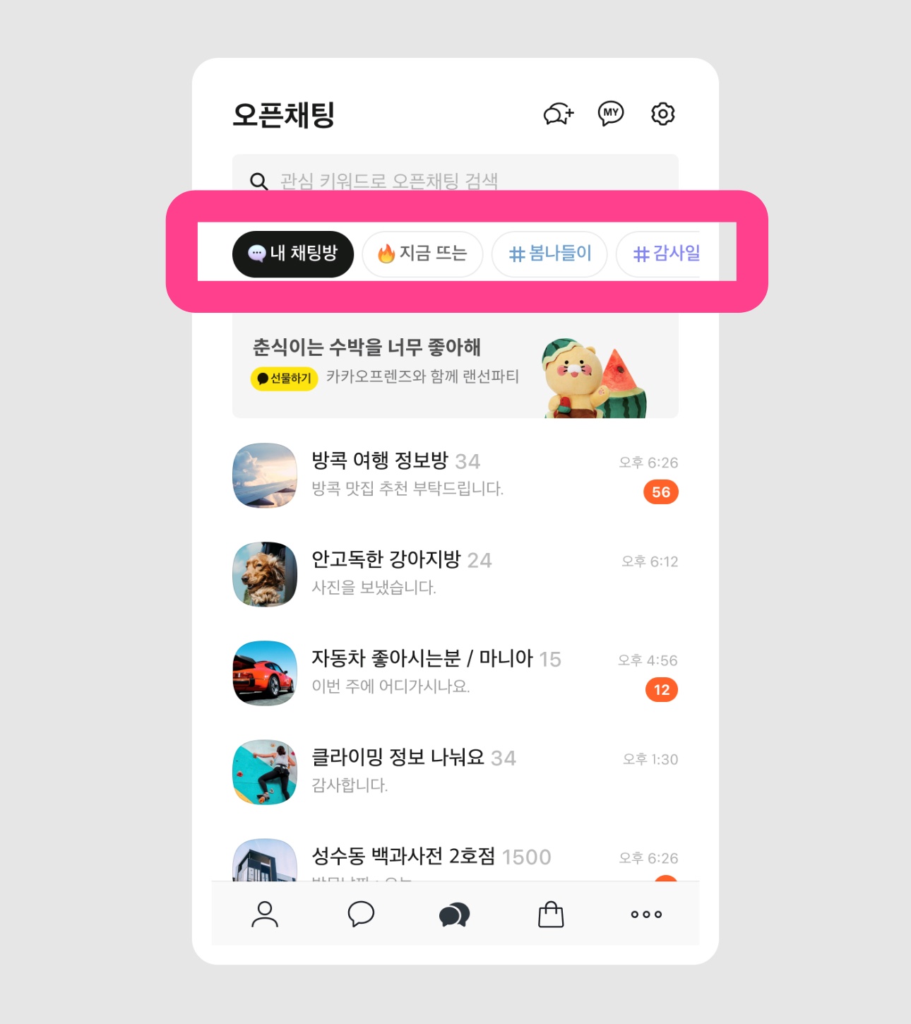 이렇게 오픈 채팅이 별도의 탭으로 독립하면서 달라진 점이 몇 가지 있습니다. 첫 번째는 오픈 채팅 탭 상단에 #지금 뜨는, #봄나들이, #하늘보기와 같은 키워드가 나타난다는 것입니다. 키워드의 주제에 따라 채팅방을 검색할 수 있기 때문에 조금 더 빠르게 관련 채팅방을 검색하거나, 또는 전혀 생각하지 못했었던 새로운 관심사를 발견할 수 도 있습니다.