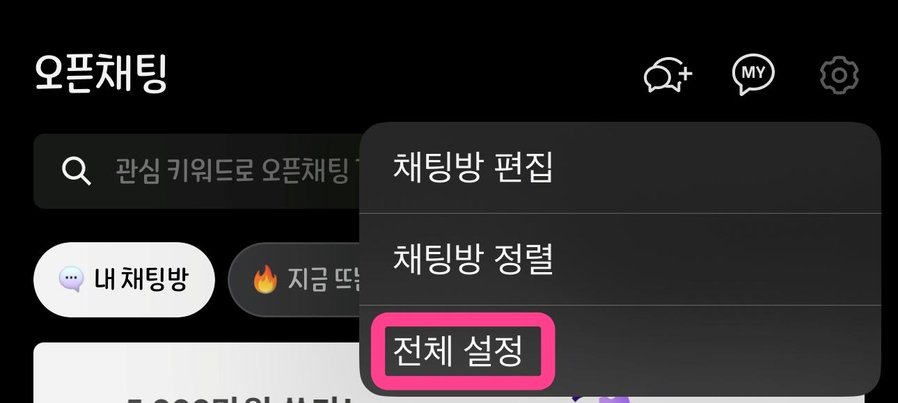 먼저 오픈채팅 탭에서 오른쪽 상단에 있는 [설정] 버튼을 클릭하고 [전체설정]을 눌러 이동합니다. 그리고 스크롤을 내려보면 아래에 [공지사항]이 있습니다.