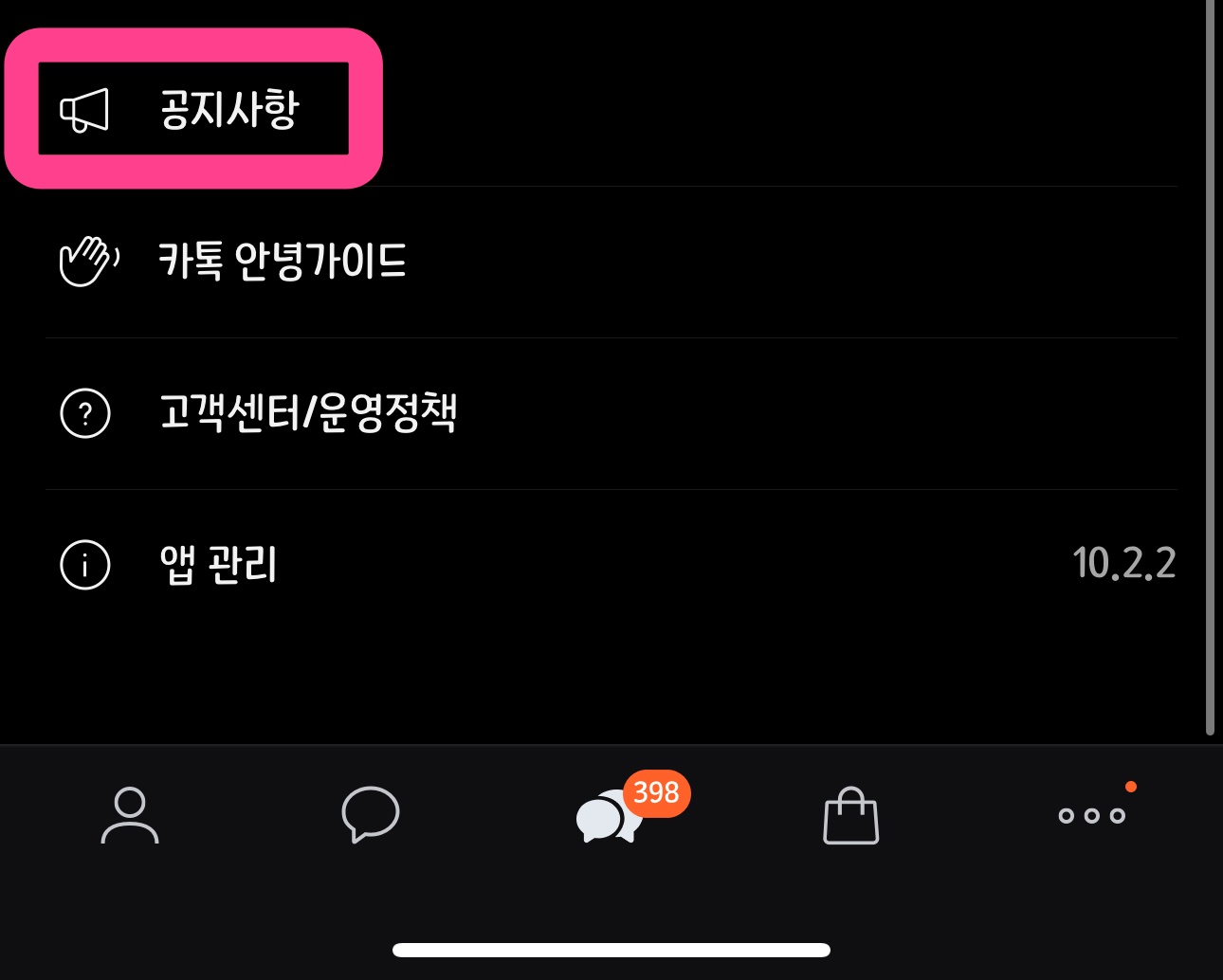 먼저 오픈채팅 탭에서 오른쪽 상단에 있는 [설정] 버튼을 클릭하고 [전체설정]을 눌러 이동합니다. 그리고 스크롤을 내려보면 아래에 [공지사항]이 있습니다.
