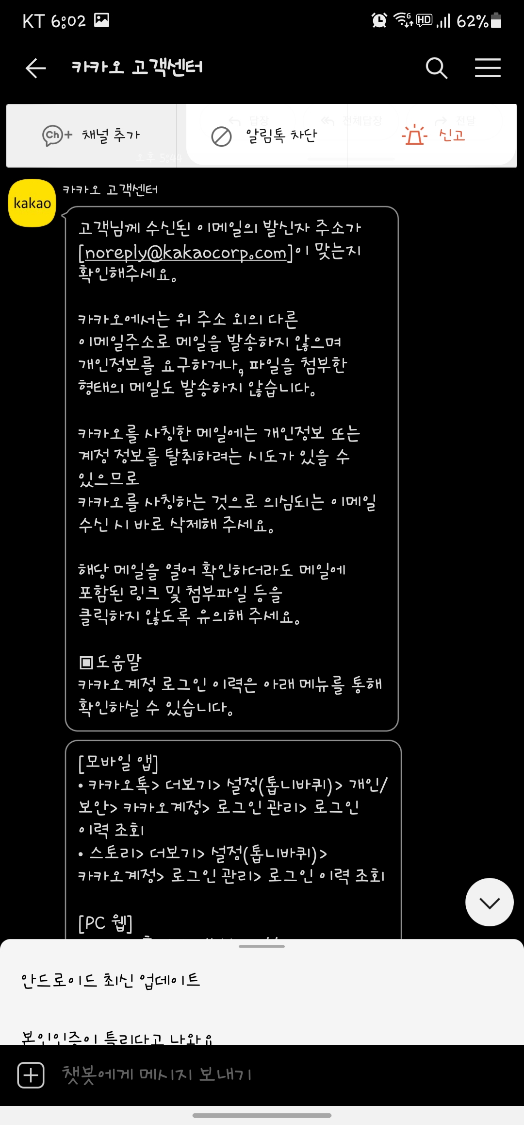 저처럼 상담 중에 링크를 받은 게 아니라, 직접 검색하시는 것이라면 카카오톡에서 카카오 고객센터를 검색하셔서 쉽게 찾으실 수 있습니다. 포털사이트에서 검색하셔서 찾으셔도 되지만 제일 간편한 건 사용하는 카카오톡에서 채널검색을 하는 게 확실히 빠르고 편한 것 같습니다. 메일에 쓰인 것처럼 kko.cs라는 아이디를 친구추가하지 않아도 검색되는 공식 채널입니다. kko.cs는 절대 검색하셔서 친구추가 하시면 안 됩니다.