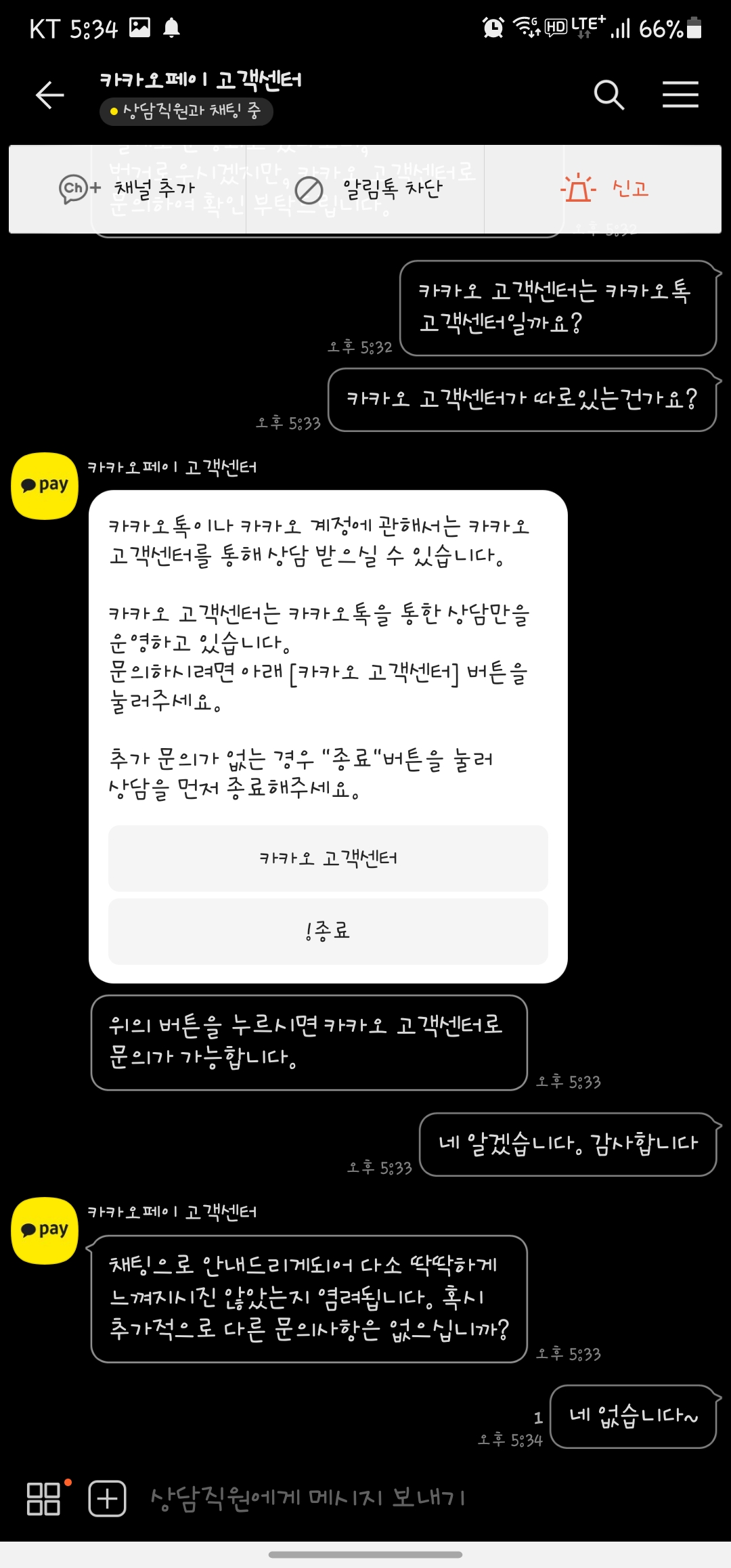 처음에는 어디다 물어봐야 할지 감이 안 잡혀서 카카오페이 고객센터로 연락했었습니다. 내 계정이 해킹이 되어서 결제요청이 들어간 것이라면, 카카오페이에 카드가 등록되어서 그런 게 아닐까 하는 생각이 들었기 때문입니다. 카카오페이 고객센터가 5시 30분까지로 되어있었고 제가 상담신청을 한 시간이 5시 29분이었습니다. 그래서 진짜 마음이 너무 급했습니다. 상담시간이 끝나서 상담을 못하면 내일까지 기다려야 한다는 불안감 때문입니다. 그래서 퇴근해서 택시 타고 가는 도중에도 계속 문의 연결이 될까 싶어서 미리 채팅도 써두고, 계속 핸드폰만 보면서 기다리고 있었습니다. 그리고 연결이 딱 되자마자 급하게 써 내려갔답니다.