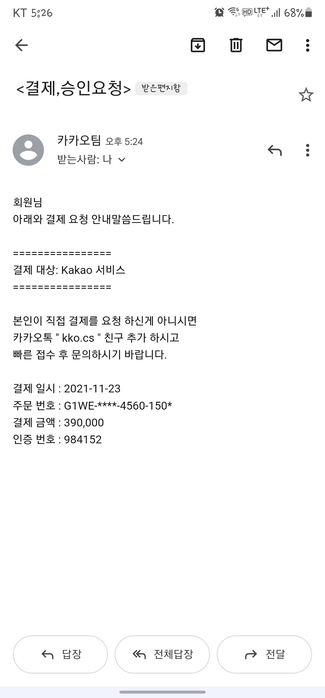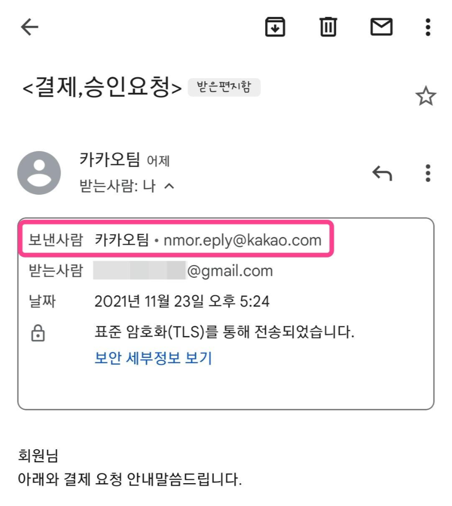 평소에 보이스피싱 같은 건 정말 조심하려고 하는 편입니다. 그런데도 처음으로 든 생각은 '어? 내가 39만 원짜리 뭘 사려고 했더라?'라는 것이었습니다. 요즘은 결제방식이 너무 편하게 되어있다 보니 내가 무얼 샀는지, 사려고 했는지 같은 건 생각이 잘 나지 않았답니다. 그리고 평소에 구글 메일을 사용하지 않아서 익숙하지 않다 보니, 어디서 메일이 왔는지 발신자의 메일주소를 확인하는 방법을 찾기가 힘들었습니다. 그래서 발신자의 메일주소 확인을 건너뛰게 되고, 카카오팀이라는 발신자명만 뜨다 보니 진짜 뭔가 결제가 되었나 싶어서 정말 놀랬습니다.