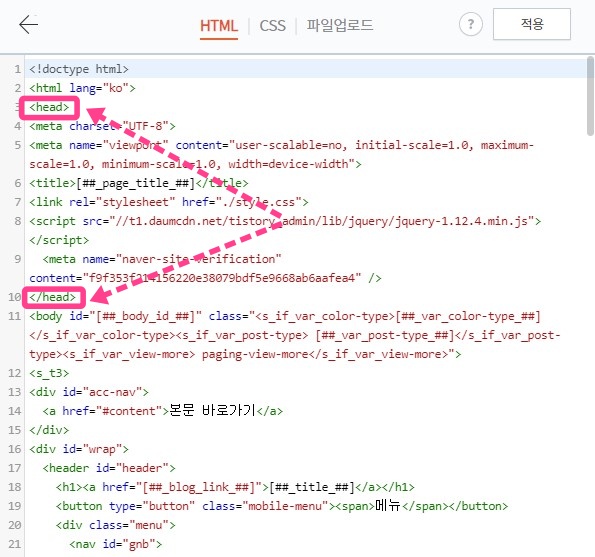 네모로 표시되어 있는 <head>와 </head> 사이에 아까 복사해 왔던 메타태그를 붙여 넣기 합니다. <head>와 </head> 사이라면 붙여 넣는 부분이 어디든 상관없습니다.