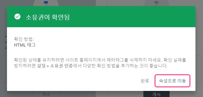 그리고 다시 구글 서치 콘솔 사이트로 돌아와서 아까 메타태그를 복사한 그 창에 있는 확인 버튼을 눌러줍니다. 그러면 소유권이 확인되었다는 창이 하나 뜨는데, 여기서 또 속성으로 이동을 클릭합니다. 완료 버튼이 아닙니다.
