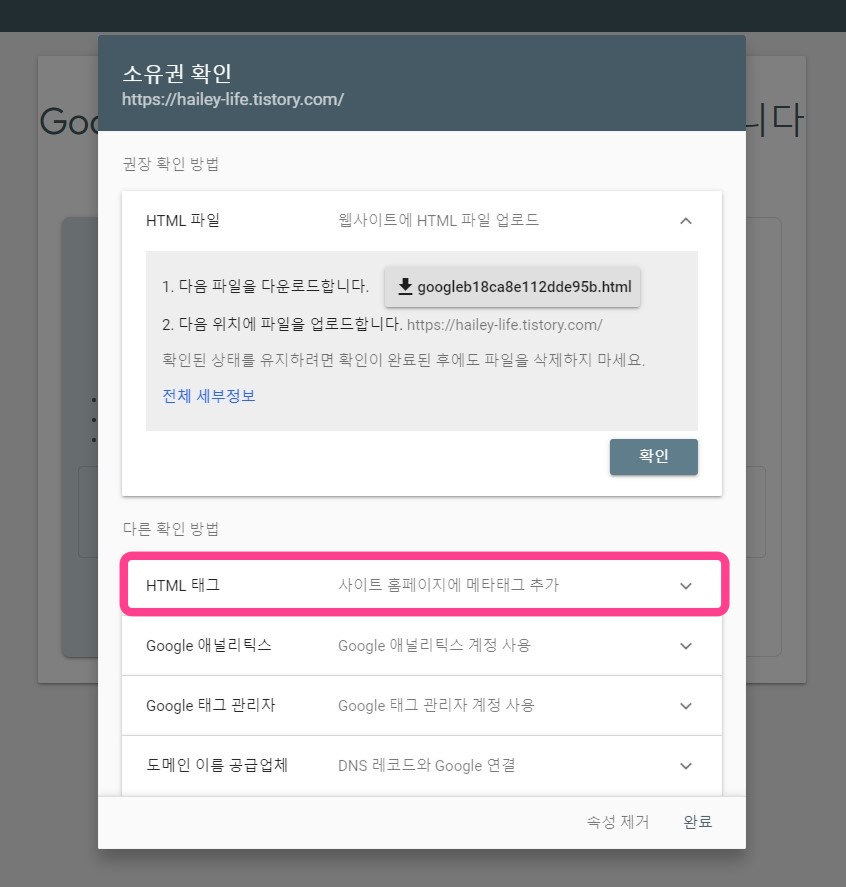 확인 버튼을 누르지 말고 아래쪽을 보면 HTML 태그 : 사이트 홈페이지에 메타태그 추가 이 부분의 화살표를 눌러줍니다.