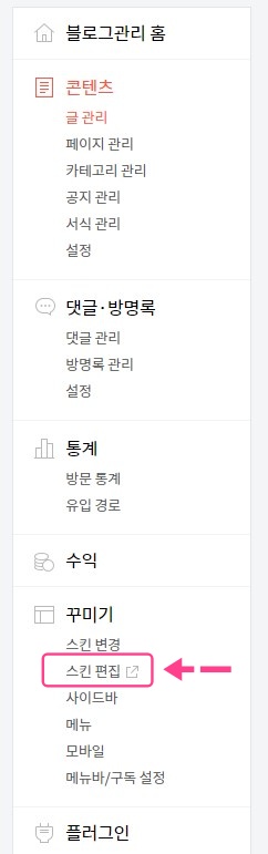 구글 서치 콘솔 사이트에서 매타 태그를 복사했다면 그 화면을 그대로 놔둔 채, 나의 티스토리 블로그 관리 화면으로 돌아와야 합니다. 블로그 관리 홈 화면의 카테고리를 찬찬히 들여다보면 꾸미기 카테고리 안에 스킨 편집 이 있습니다. 스킨 편집을 클릭합니다.