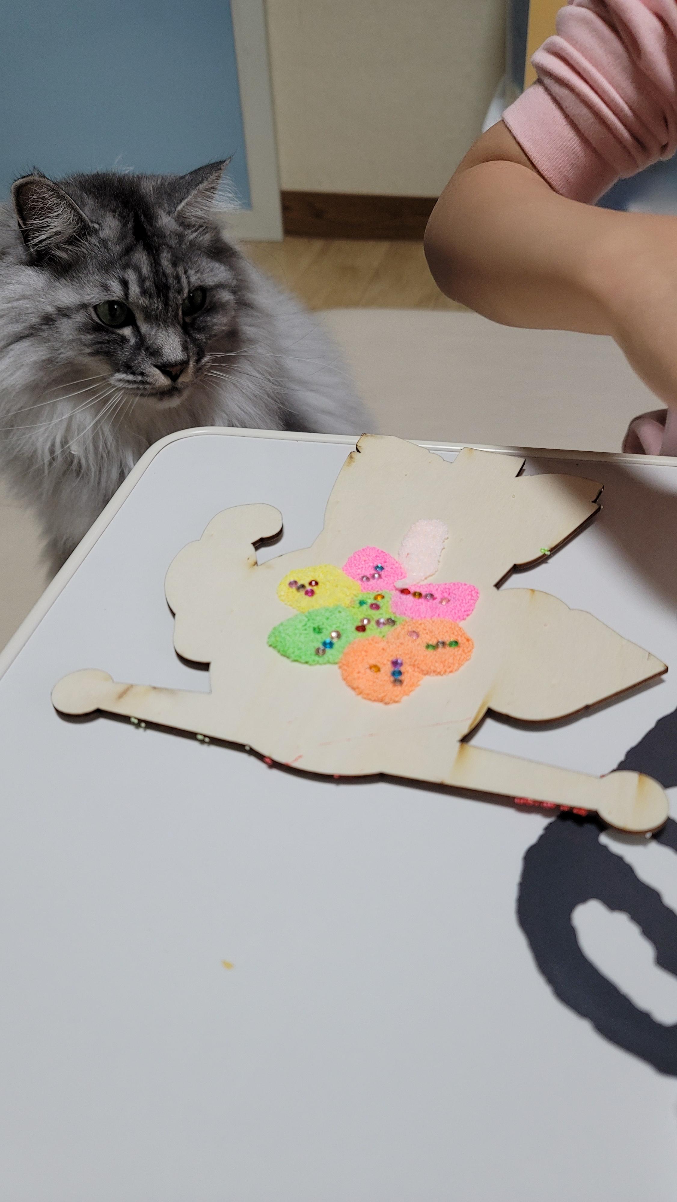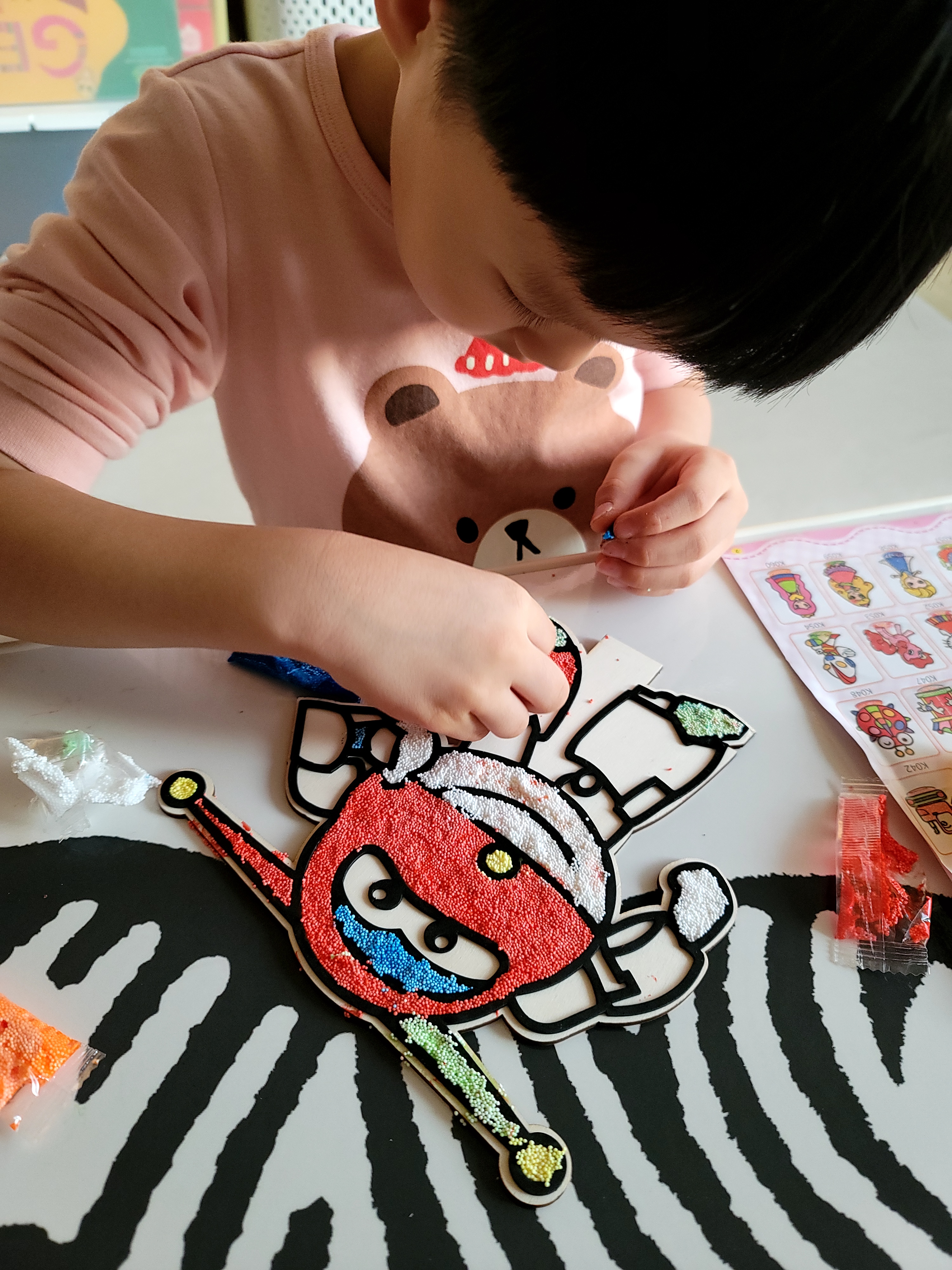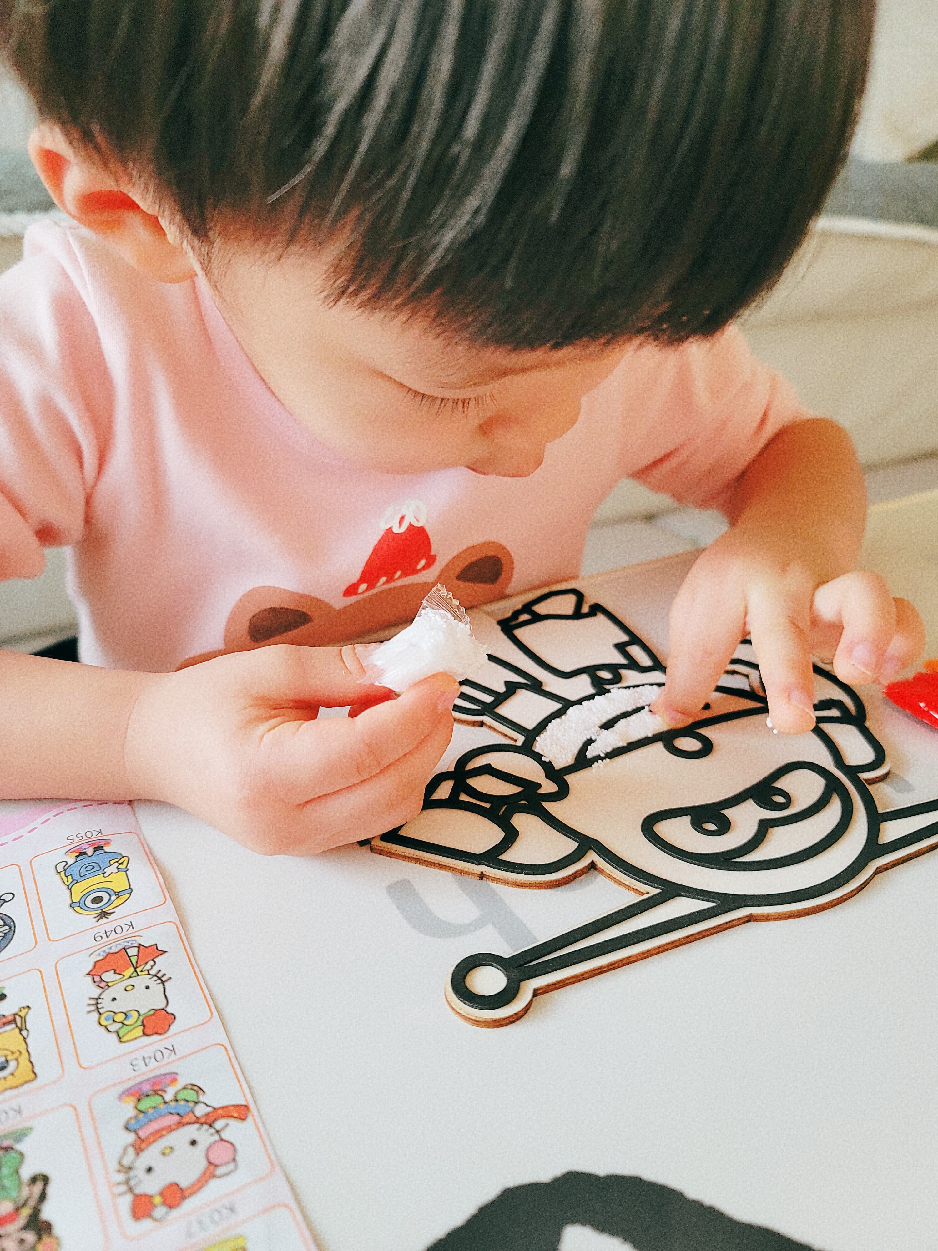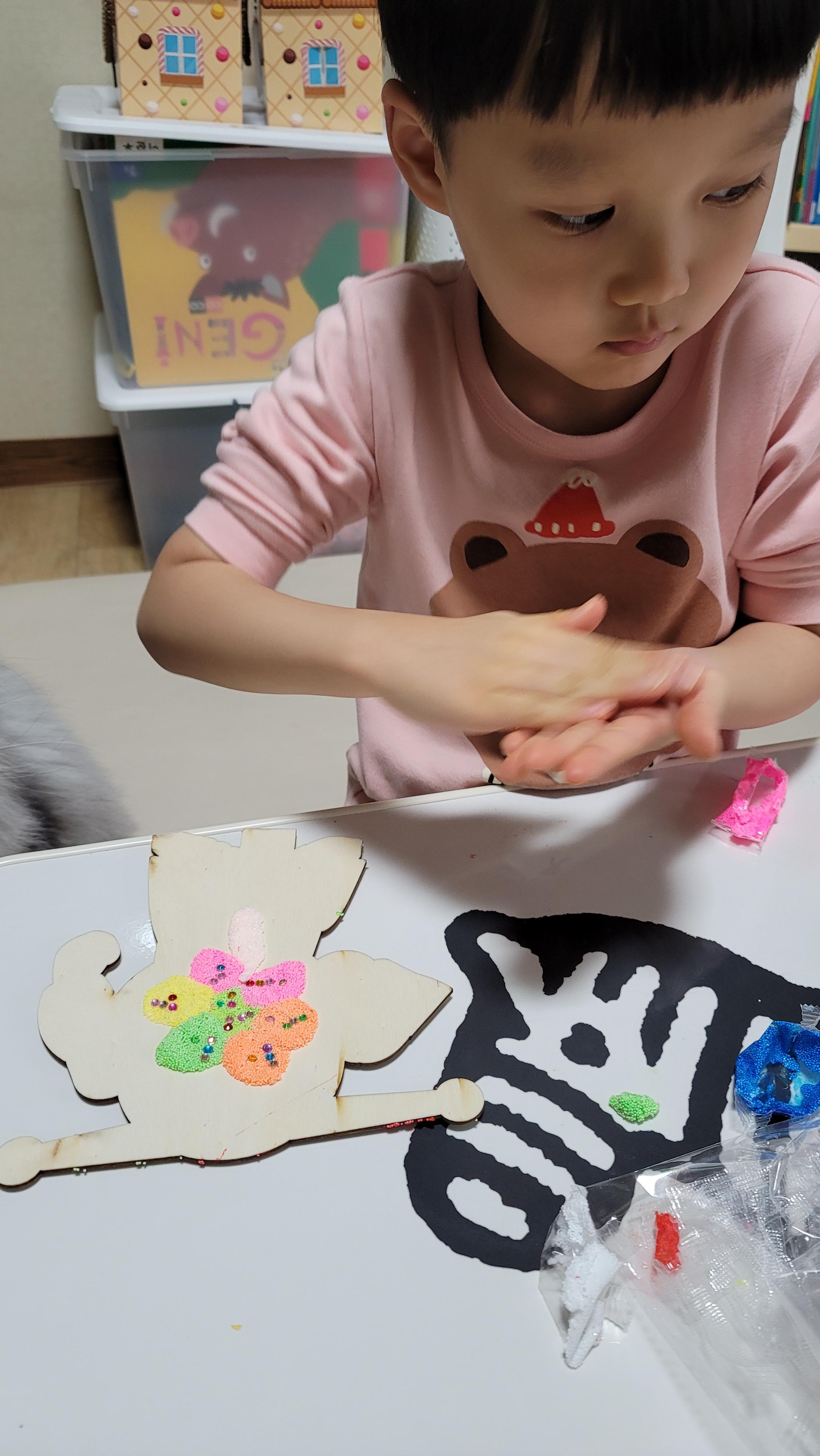 고사리 같은 손으로 검은선을 넘어가지 않도록 조심조심하며 채워 넣는 게 너무 귀여웠습니다. 쪼꼬맹이는 아직 어려서 만드는 도중에 잘 안되면 짜증을 내기도 하지만, 엄마가 도와주면 금세 또 재밌어하며 열심히 한답니다. 빨간색이 모자라서 호기 다리를 핑크색으로 채워주었더니 예쁘다고 좋아합니다.