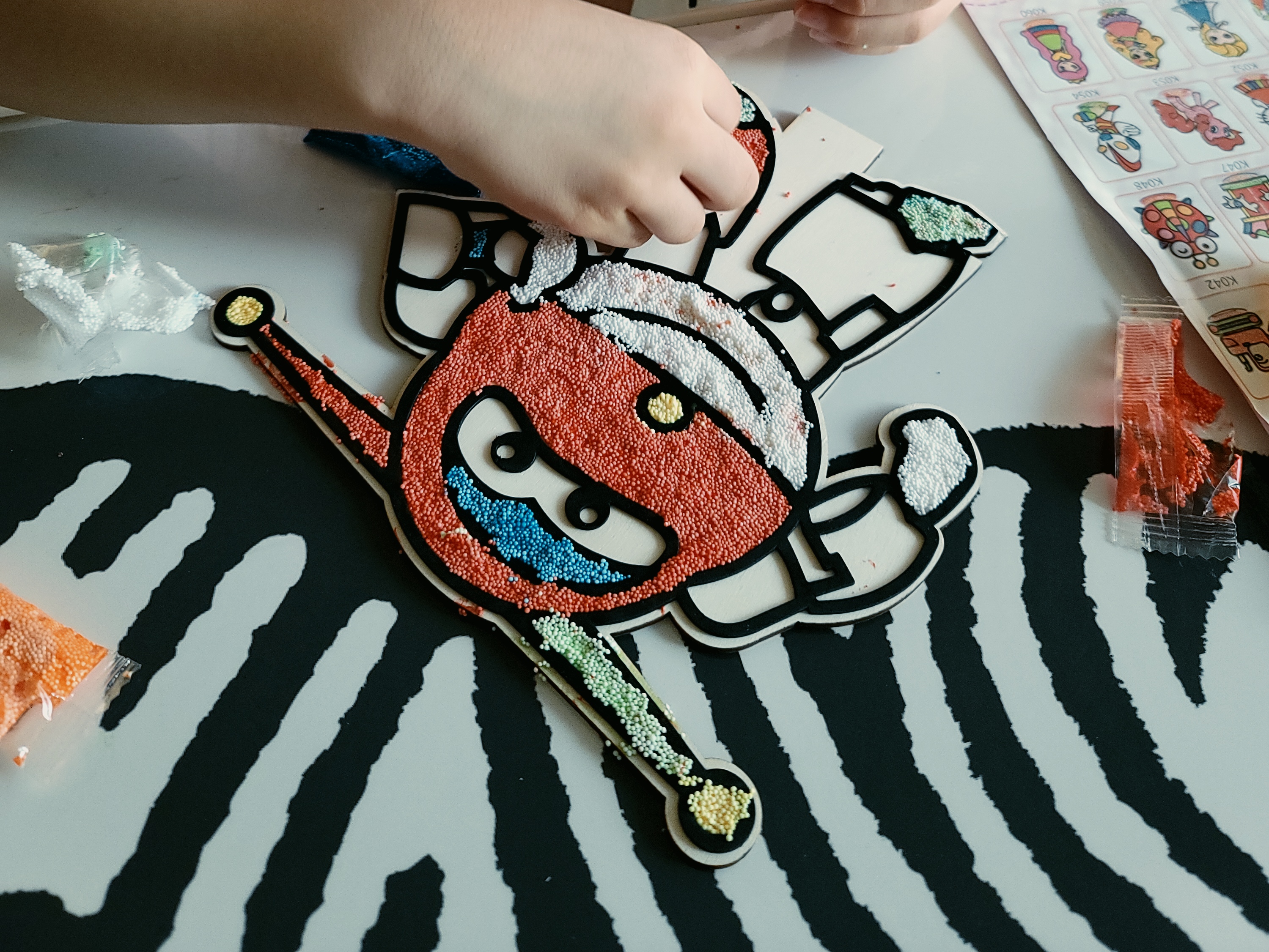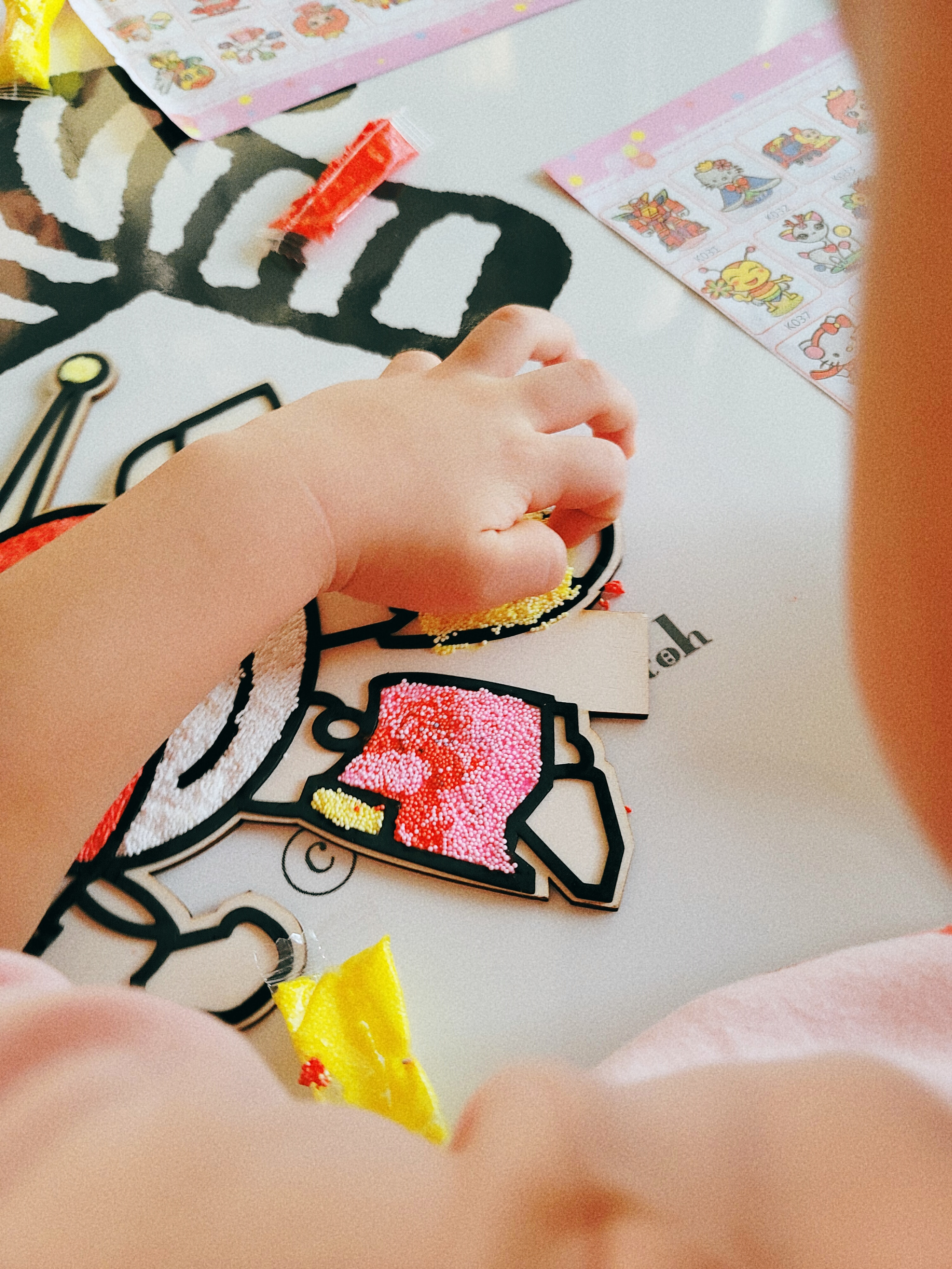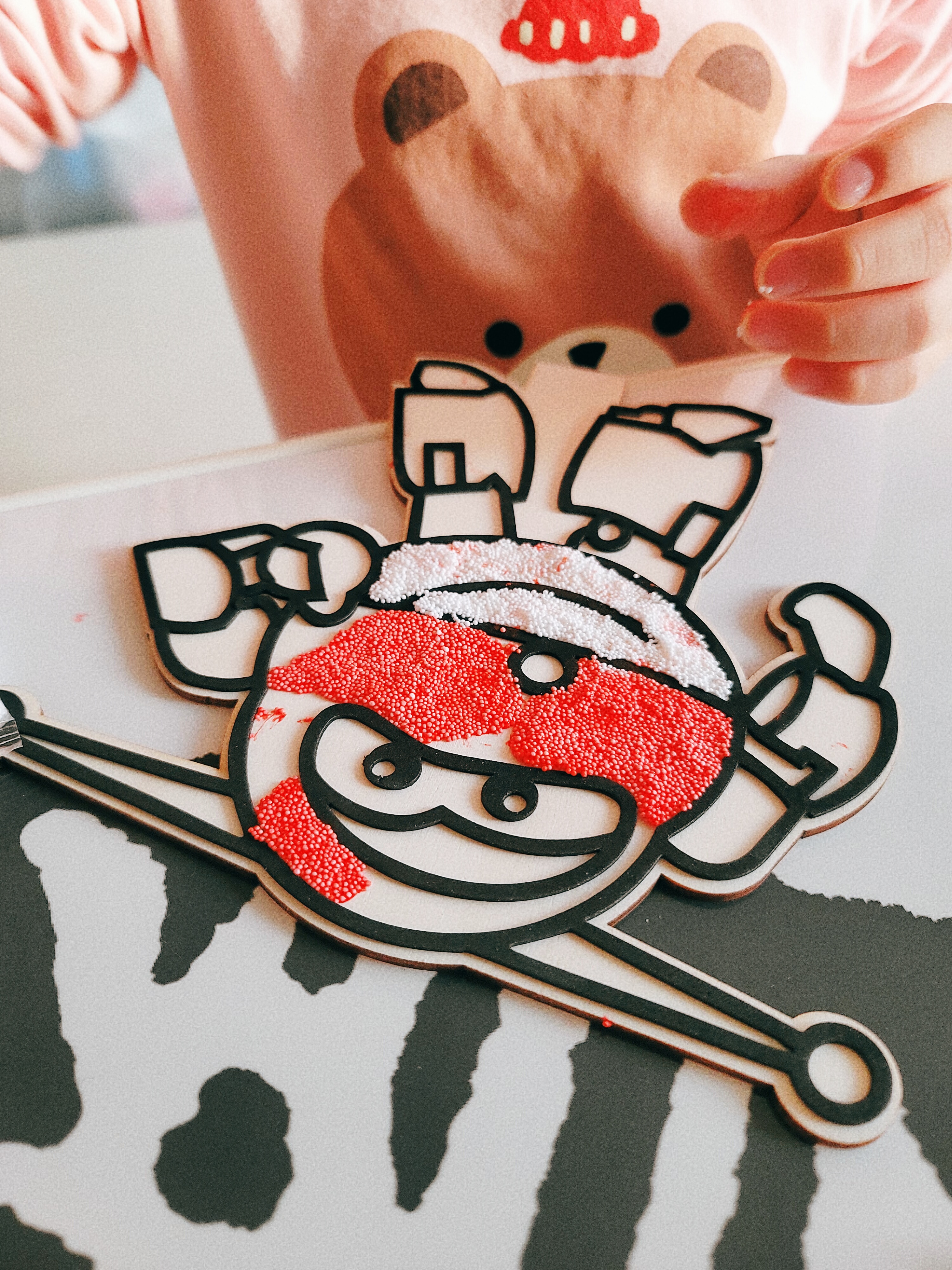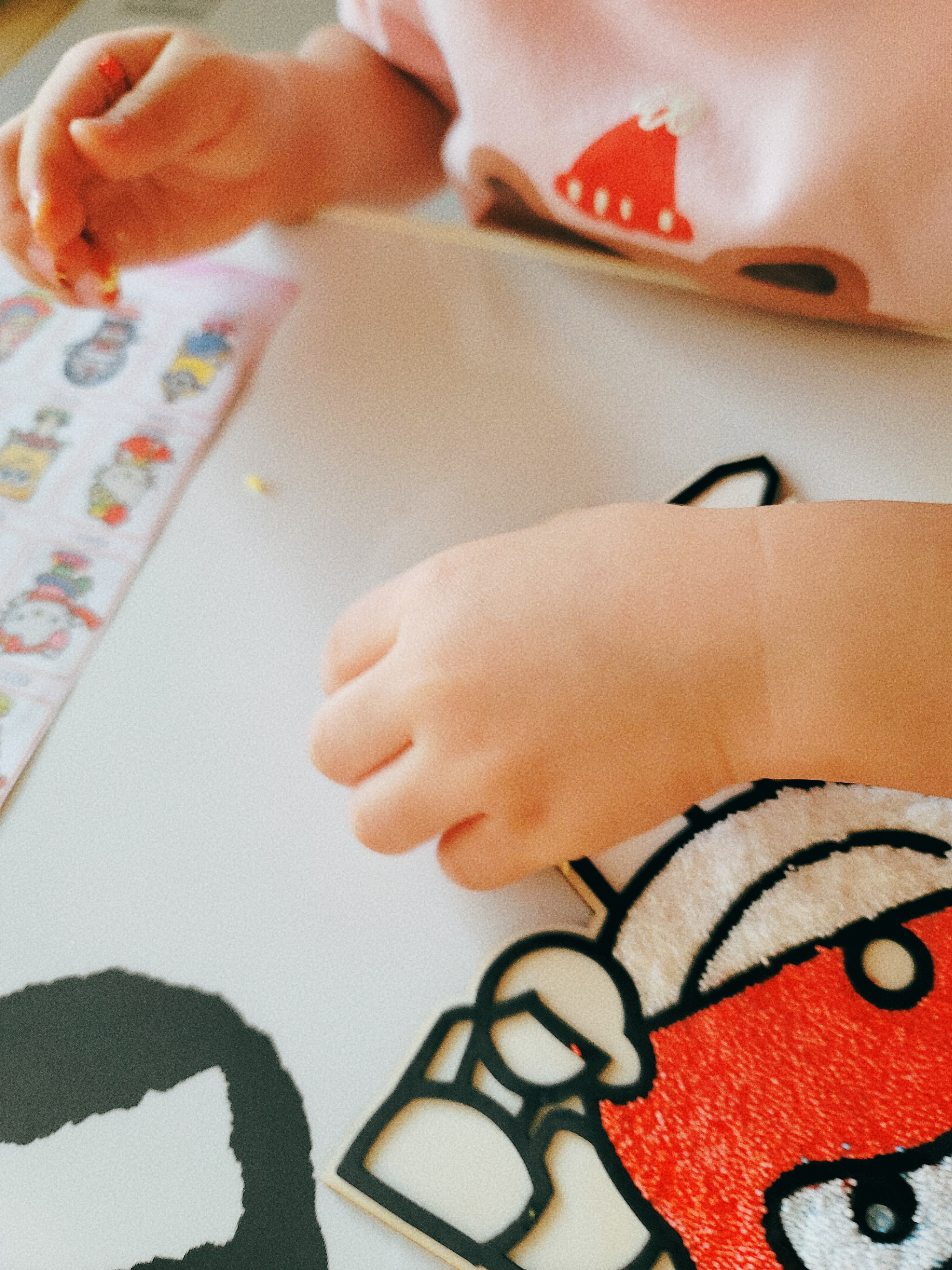 고사리 같은 손으로 검은선을 넘어가지 않도록 조심조심하며 채워 넣는 게 너무 귀여웠습니다. 쪼꼬맹이는 아직 어려서 만드는 도중에 잘 안되면 짜증을 내기도 하지만, 엄마가 도와주면 금세 또 재밌어하며 열심히 한답니다. 빨간색이 모자라서 호기 다리를 핑크색으로 채워주었더니 예쁘다고 좋아합니다.